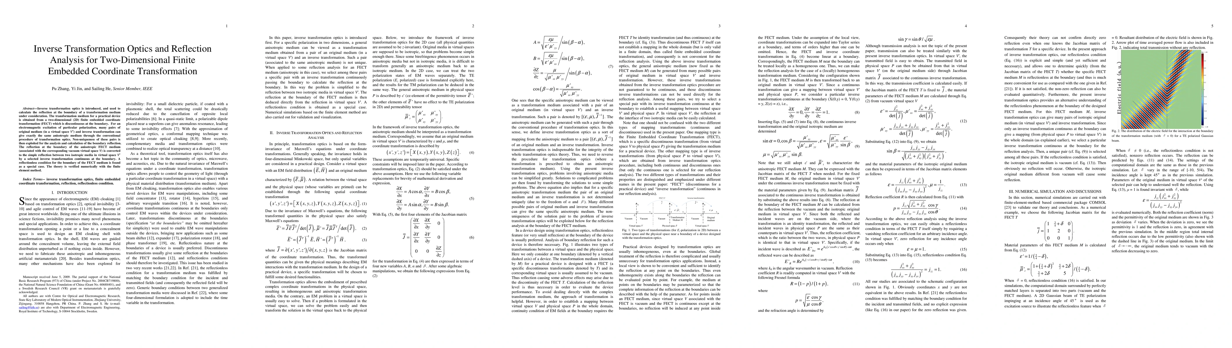 Inverse transformation optics is introduced, and used to calculate the reflection at the boundary of a transformation medium under consideration. The transformation medium for a practical device is obtained from a two-dimensional (2D) finite embedded coordinate transformation (FECT) which is discontinuous at the boundary. For an electromagnetic excitation of particular polarization, many pairs of original medium (in a virtual space V') and inverse transformation can give exactly the same anisotropic medium through the conventional procedure of transformation optics. Non-uniqueness of these pairs is then exploited for the analysis and calculation of the boundary reflection. The reflection at the boundary of the anisotropic FECT medium (associated with the corresponding vacuum virtual space V) is converted to the simple reflection between two isotropic media in virtual space V' by a selected inverse transformation continuous at the boundary. A reflectionless condition for the boundary of the FECT medium is found as a special case. The theory is verified numerically with the finite element method.