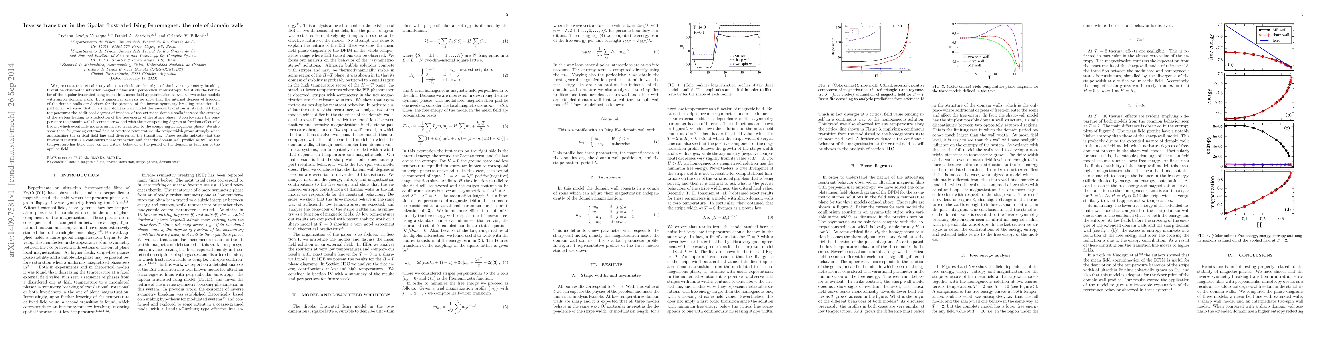 We present a theoretical study aimed to elucidate the origin of the inverse symmetry breaking transition observed in ultrathin magnetic films with perpendicular anisotropy. We study the behavior of the dipolar frustrated Ising model in a mean field approximation as well as two other models with simple domain walls. By a numerical analysis we show that the internal degrees of freedom of the domain walls are decisive for the presence of the inverse symmetry breaking transition. In particular, we show that in a sharp domain wall model the inverse transition is absent. At high temperatures the additional degrees of freedom of the extended domain walls increase the entropy of the system leading to a reduction of the free energy of the stripe phase. Upon lowering the temperature the domain walls become narrow and with the corresponding degrees of freedom effectively frozen, which eventually induces an inverse transition to the competing homogeneous phase. We also show that, for growing external field at constant temperature, the stripe width grows strongly when approaching the critical field line and diverges at the transition. These results indicate that the inverse transition is a continuous phase transition and that the domain wall profiles as well as the temperature has little effect on the critical behavior of the period of the domain as function of the applied field.
