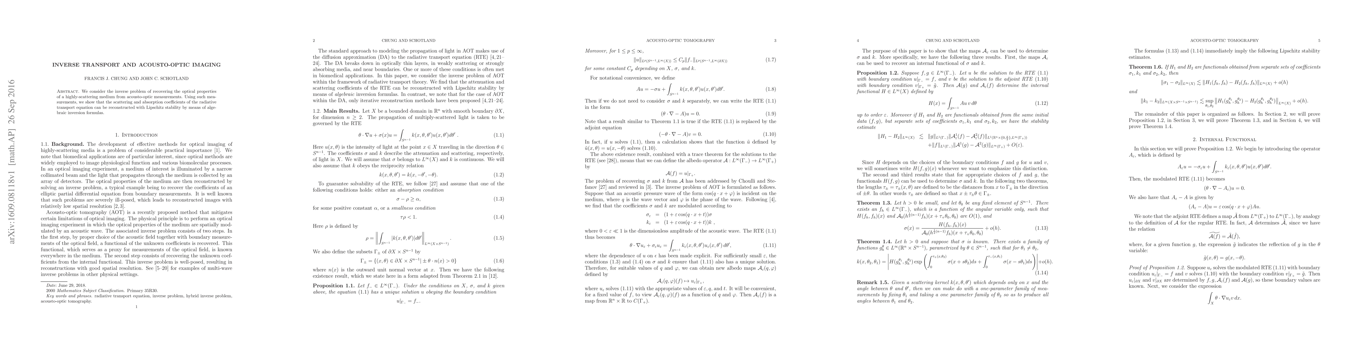 We consider the inverse problem of recovering the optical properties of a highly-scattering medium from acousto-optic measurements. Using such measurements, we show that the scattering and absorption coefficients of the radiative transport equation can be reconstructed with Lipschitz stability by means of algebraic inversion formulas.