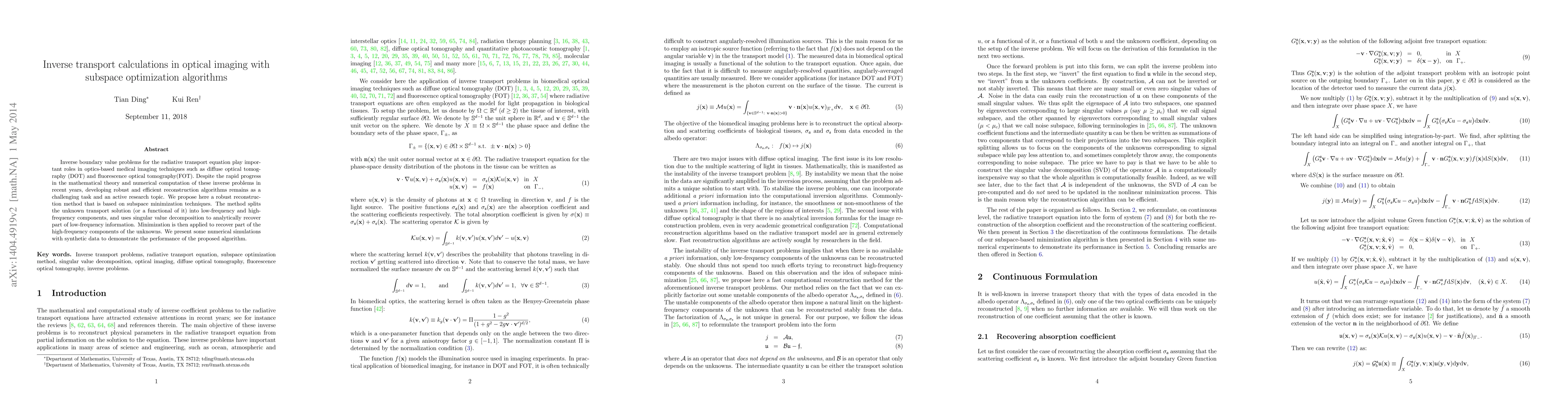 Inverse boundary value problems for the radiative transport equation play important roles in optics-based medical imaging techniques such as diffuse optical tomography (DOT) and fluorescence optical tomography (FOT). Despite the rapid progress in the mathematical theory and numerical computation of these inverse problems in recent years, developing robust and efficient reconstruction algorithms remains as a challenging task and an active research topic. We propose here a robust reconstruction method that is based on subspace minimization techniques. The method splits the unknown transport solution (or a functional of it) into low-frequency and high-frequency components, and uses singular value decomposition to analytically recover part of low-frequency information. Minimization is then applied to recover part of the high-frequency components of the unknowns. We present some numerical simulations with synthetic data to demonstrate the performance of the proposed algorithm.