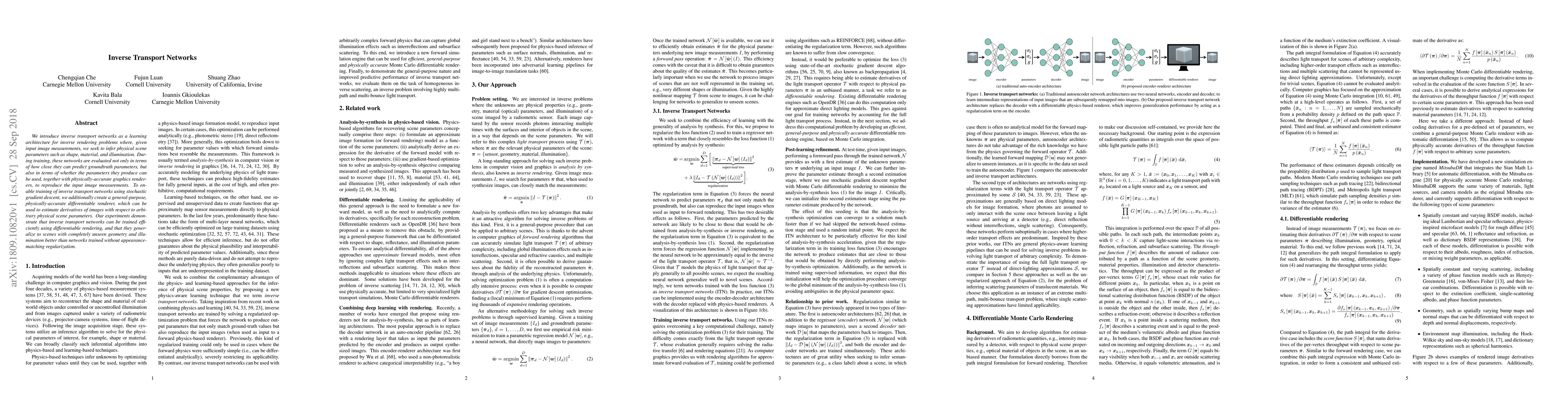 We introduce inverse transport networks as a learning architecture for inverse rendering problems where, given input image measurements, we seek to infer physical scene parameters such as shape, material, and illumination. During training, these networks are evaluated not only in terms of how close they can predict groundtruth parameters, but also in terms of whether the parameters they produce can be used, together with physically-accurate graphics renderers, to reproduce the input image measurements. To en- able training of inverse transport networks using stochastic gradient descent, we additionally create a general-purpose, physically-accurate differentiable renderer, which can be used to estimate derivatives of images with respect to arbitrary physical scene parameters. Our experiments demonstrate that inverse transport networks can be trained efficiently using differentiable rendering, and that they generalize to scenes with completely unseen geometry and illumination better than networks trained without appearance- matching regularization.