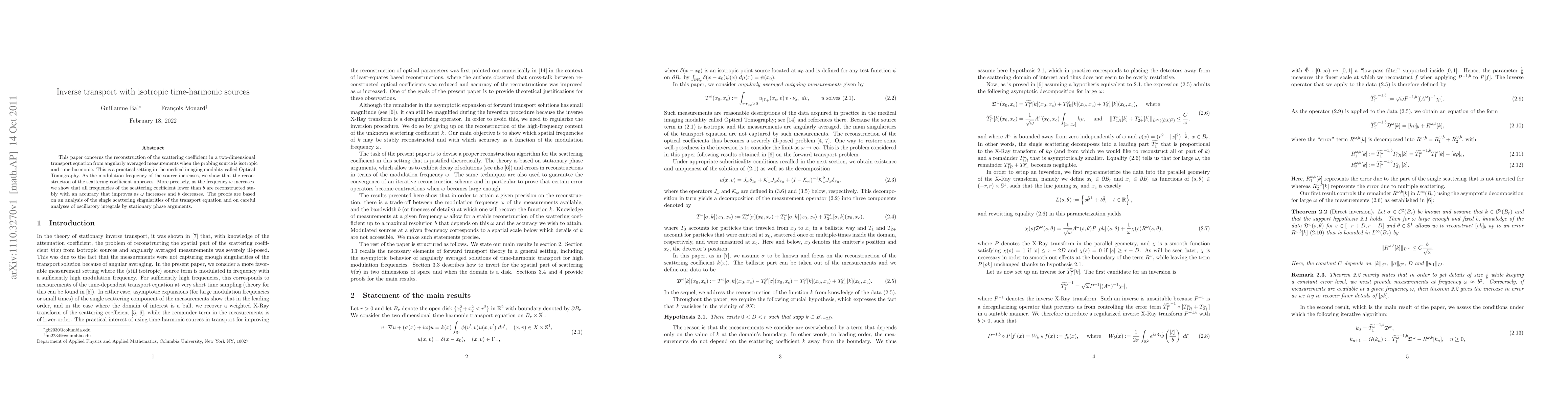 This paper concerns the reconstruction of the scattering coefficient in a two-dimensional transport equation from angularly averaged measurements when the probing source is isotropic and time-harmonic. This is a practical setting in the medical imaging modality called Optical Tomography. As the modulation frequency of the source increases, we show that the reconstruction of the scattering coefficient improves. More precisely, as the frequency $\omega$ increases, we show that all frequencies of the scattering coefficient lower than $b$ are reconstructed stably with an accuracy that improves as $\omega$ increases and $b$ decreases. The proofs are based on an analysis of the single scattering singularities of the transport equation and on careful analyses of oscillatory integrals by stationary phase arguments.