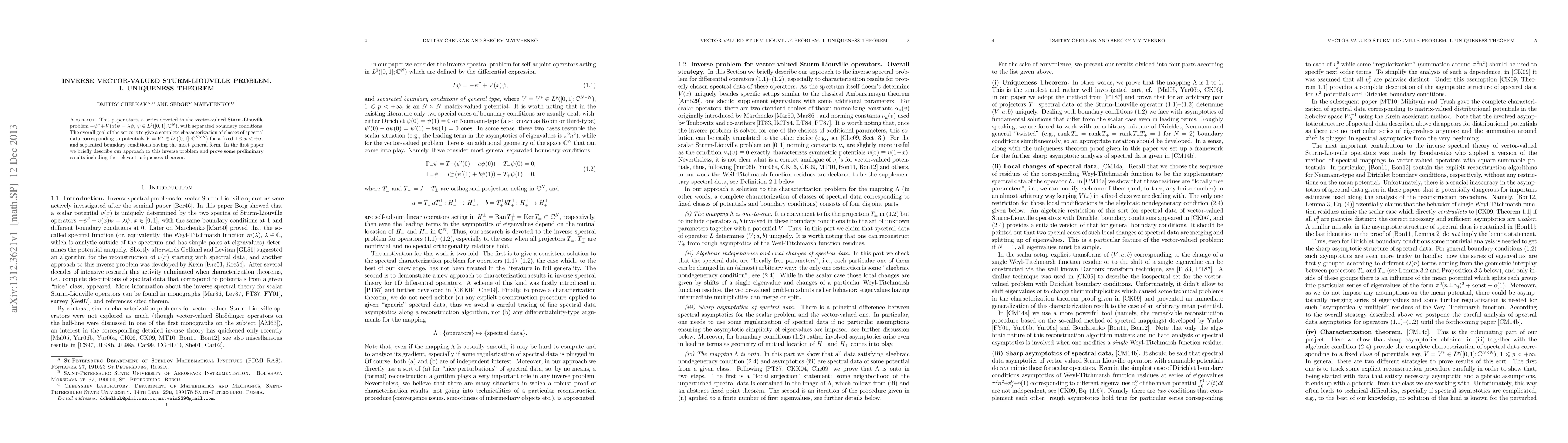 This paper starts a series devoted to the vector-valued Sturm-Liouville problem $-\psi''+V(x)\psi=\lambda\psi$, $\psi\in L^2([0,1];\mathbb{C}^N)$, with separated boundary conditions. The overall goal of the series is to give a complete characterization of classes of spectral data corresponding to potentials $V=V^*\in L^p([0,1];\mathbb{C}^{N\times N})$ for a fixed $1\le p <+\infty$ and separated boundary conditions having the most general form. In the first paper we briefly describe our approach to this inverse problem and prove some preliminary results including the relevant uniqueness theorem.