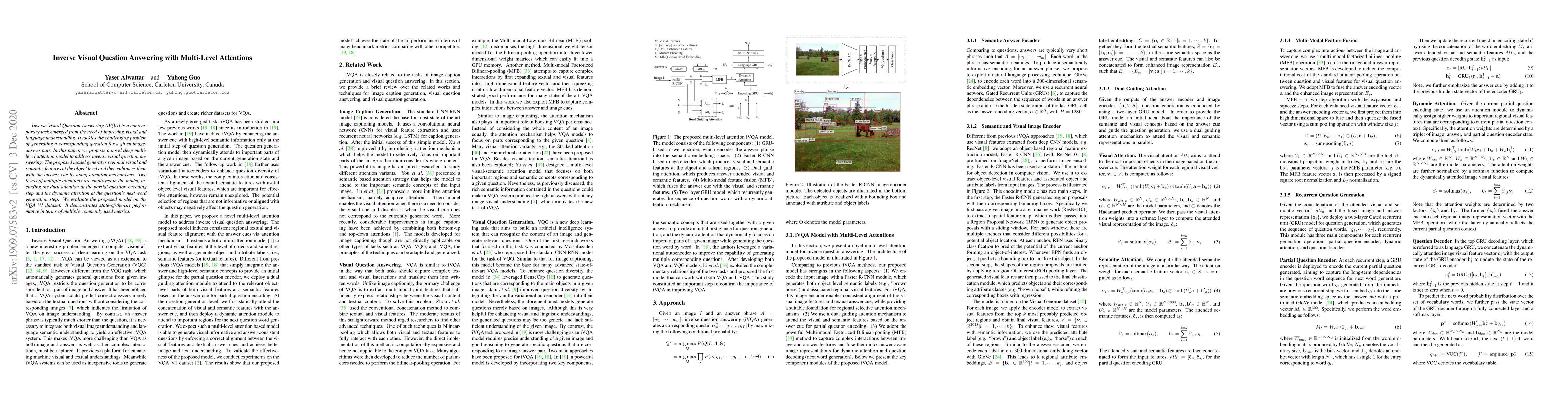 This paper introduces a deep learning model using multi-level attentions to tackle inverse visual question answering. The model extracts object-level visual and semantic features, then refines them with answer cues via attention mechanisms. It employs dual attention for encoding partial questions and dynamic attention for generating subsequent question words, achieving state-of-the-art performance on the VQA V1 dataset.