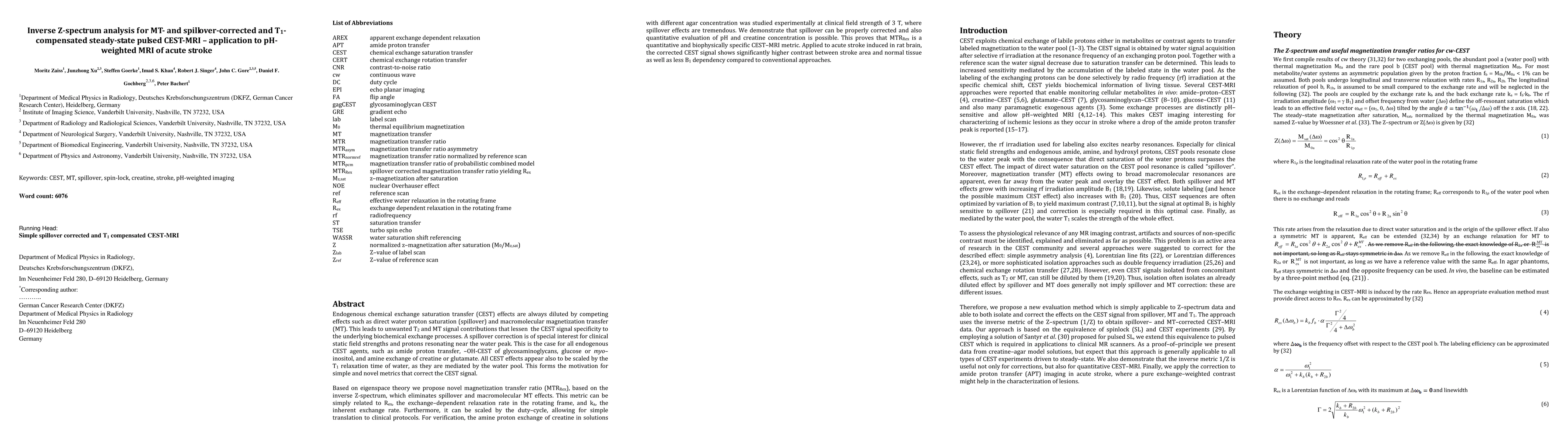 Endogenous chemical exchange saturation transfer (CEST) effects are always diluted by competing effects such as direct water proton saturation (spillover) and macromolecular magnetization transfer (MT). This leads to T2-and MT-shine-through effects in the actual biochemical contrast of CEST. Therefore, a simple evaluation algorithm which corrects the CEST signal was searched for. By employing a recent eigenspace theory valid for spinlock and continuous wave (cw) CEST we predict that the inverse Z-spectrum is beneficial to Z-spectrum itself. Based on this we propose a new spillover- and MT-corrected magnetization transfer ratio (MTRRex) yielding Rex, the exchange dependent relaxation rate in the rotating frame. For verification, the amine proton exchange of creatine in solutions with different agar concentration was studied experimentally at clinical field strength of 3T. In contrast to the compared standard evaluation for pulsed CEST experiments, MTRasym, our approach shows no T2 or MT shine through effect. We demonstrate that spillover can be corrected properly and also quantitative evaluation of pH and creatine concentration is possible which proves MTRRex as quantitative CEST-MRI method. A spillover correction is of special interest for clinical static field strengths and protons resonating near the water peak. This is the case for -OH-CEST effects like gagCEST or glucoCEST, but also amine exchange of creatine or glutamate which require high B1. Although, only showed for amine exchange, we propose our normalization to work generally for DIACEST, PARACEST in slow- and fast exchange regime not just as a correction, but also for quantitative CEST-MRI. Applied to acute stroke induced in rat brain, the corrected CEST signal shows significantly higher contrast between stroke area and normal tissue as well as less B1 dependency compared to conventional approaches.
