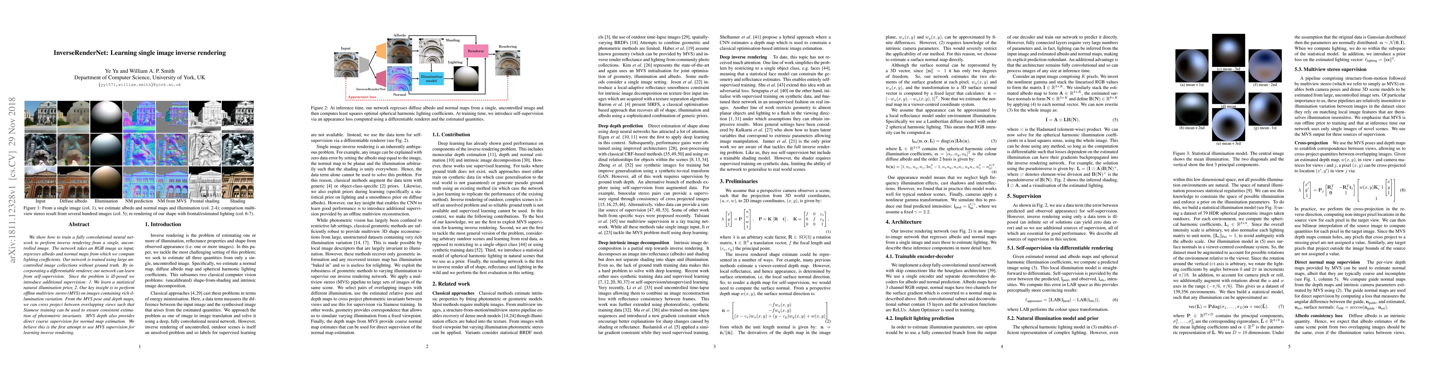 InverseRenderNet trains a convolutional neural network for inverse rendering from single images using self-supervision and differentiable rendering. It leverages statistical illumination priors and multiview stereo (MVS) for additional supervision to ensure consistent photometric invariants and coarse normal map estimation.