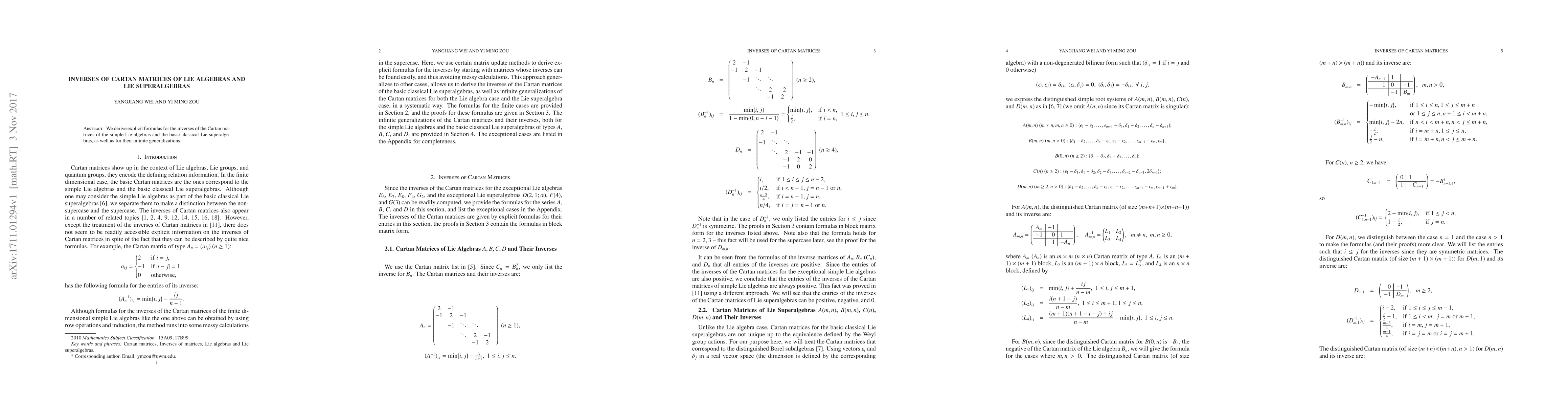 We derive explicit formulas for the inverses of the Cartan matrices of the simple Lie algebras and the basic classical Lie superalgebras, as well as for their infinite generalizations.