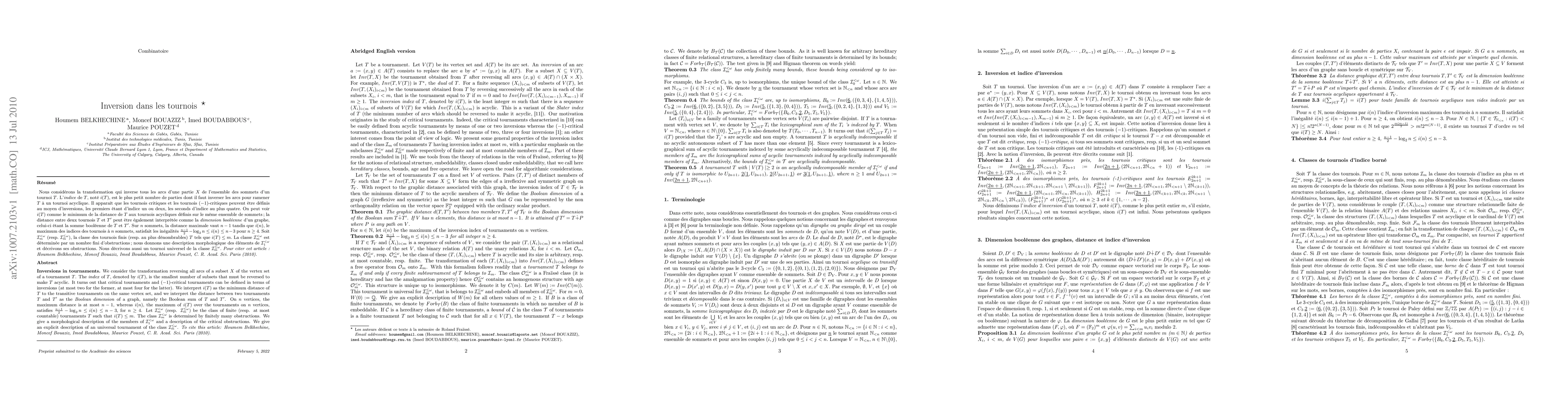 We consider the transformation reversing all arcs of a subset $X$ of the vertex set of a tournament $T$. The \emph{index} of $T$, denoted by $i(T)$, is the smallest number of subsets that must be reversed to make $T$ acyclic. It turns out that critical tournaments and $(-1)$-critical tournaments can be defined in terms of inversions (at most two for the former, at most four for the latter). We interpret $i(T)$ as the minimum distance of $T$ to the transitive tournaments on the same vertex set, and we interpret the distance between two tournaments $T$ and $T'$ as the \emph{Boolean dimension} of a graph, namely the Boolean sum of $T$ and $T'$. On $n$ vertices, the maximum distance is at most $n-1$, whereas $i(n)$, the maximum of $i(T)$ over the tournaments on $n$ vertices, satisfies $\frac {n-1}{2} - \log_{2}n \leq i(n) \leq n-3$, for $n \geq 4$. Let $ \mathcal{I}_{m}^{< \omega}$ (resp. $\mathcal{I}_{m}^{\leq \omega}$) be the class of finite (resp. at most countable) tournaments $T$ such that $i(T) \leq m$. The class $\mathcal {I}_{m}^{< \omega}$ is determined by finitely many obstructions. We give a morphological description of the members of $\mathcal {I}_{1}^{< \omega}$ and a description of the critical obstructions. We give an explicit description of an universal tournament of the class $\mathcal{I}_{m}^{\leq \omega}$.