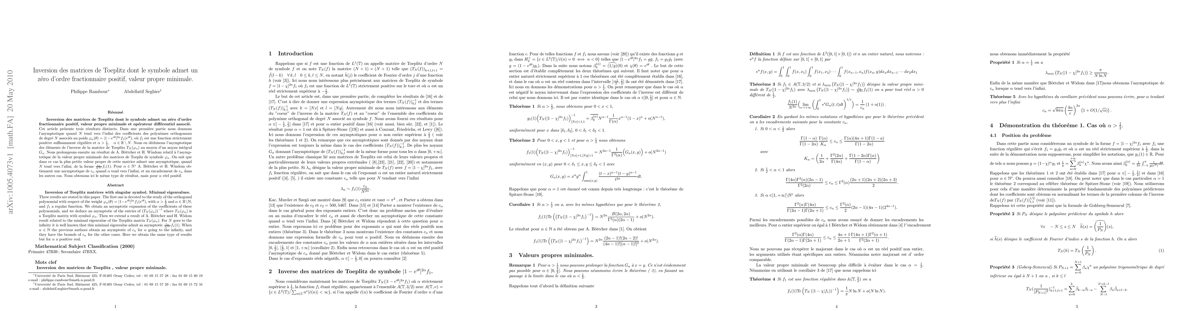 Inversion of Toeplitz matrices with singular symbol. Minimal eigenvalues. Three results are stated in this paper. The first one is devoted to the study of the orthogonal polynomial with respect of the weight $\varphi_{\alpha} (\theta)=\vert 1- e^{i \theta} \vert ^{2\alpha} f_{1}(e^{i \theta})$, with $\alpha> \demi$ and $\alpha \in \rr \setminus \nn $, and $f_{1}$ a regular function. We obtain an asymptotic expansion of the coefficients of these polynomials, and we deduce an asymptotic of the entries of $\left( T_{N} (\varphi_{\alpha})\right)^{-1}$ where $T_{N} (\varphi_{\alpha})$ is a Toeplitz matrix with symbol $\varphi_{\alpha}$. Then we extend a result of A. B\"ottcher and H. Widom result related to the minimal eigenvalue of the Toeplitz matrix $T_{N}(\varphi_{\alpha})$. For $N$ goes to the infinity it is well known that this minimal eigenvalue admit as asymptotic $\frac{c_{\alpha}}{N^{2\alpha}} f_{1}(1)$. When $\alpha\in \nn$ the previous authors obtain an asymptotic of $c_{\alpha}$ for $\alpha$ going to the infinity, and they have the bounds of $c_{\alpha}$ for the other cases. Here we obtain the same type of results but for $\alpha$ a positive real.
