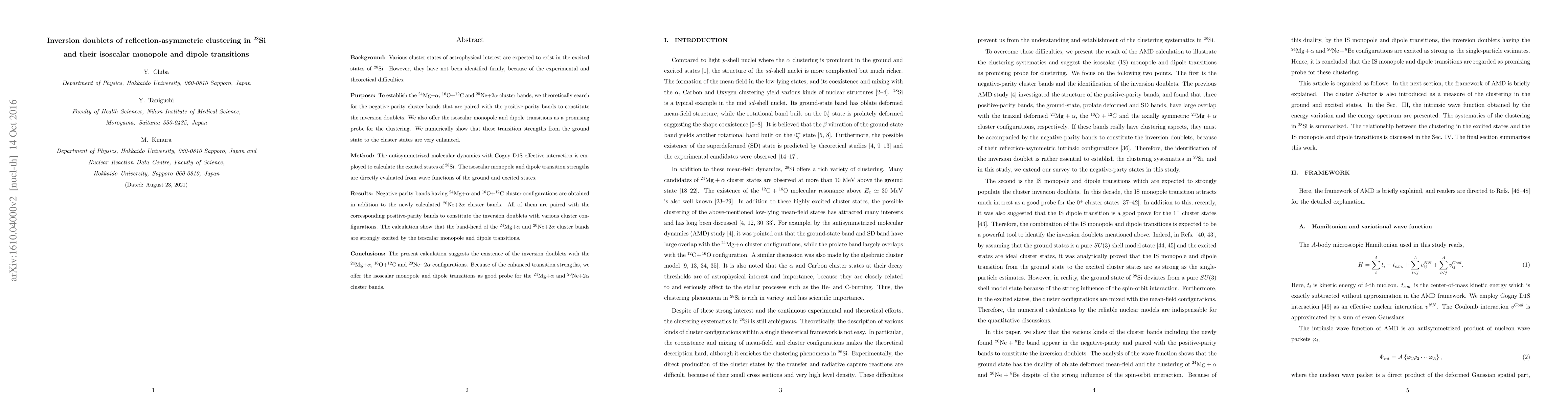 This paper investigates the existence of inversion doublets in $^{28}$Si, proposing $^{24}$Mg+$\alpha$, $^{16}$O+$^{12}$C, and $^{20}$Ne+2$\alpha$ cluster configurations. It suggests enhanced isoscalar monopole and dipole transitions as effective probes for these clusters.