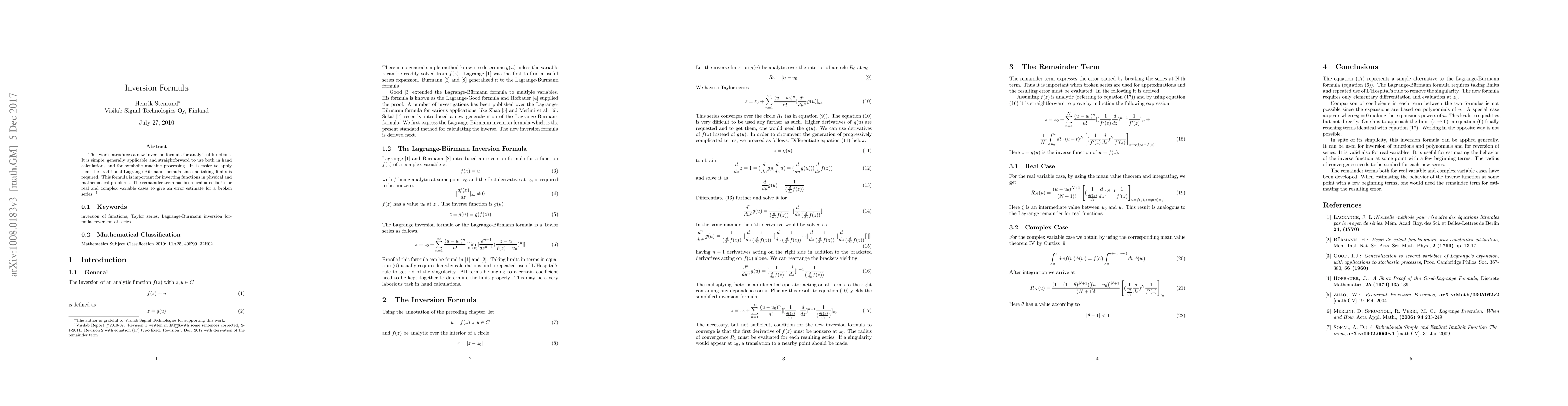 This work introduces a new inversion formula for analytical functions. It is simple, generally applicable and straightforward to use both in hand calculations and for symbolic machine processing. It is easier to apply than the traditional Lagrange-Burmann formula since no taking limits is required. This formula is important for inverting functions in physical and mathematical problems.