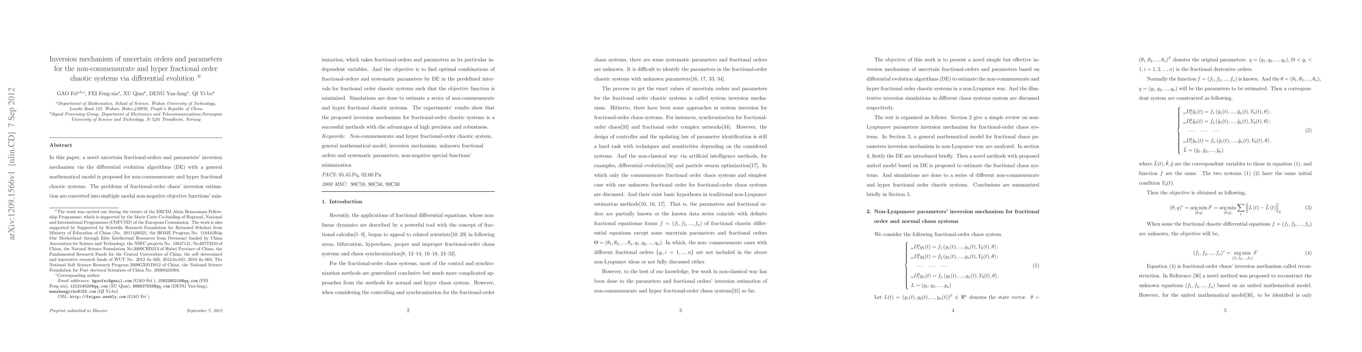 The paper presents a differential evolution-based inversion mechanism for identifying uncertain orders and parameters in non-commensurate and hyper fractional order chaotic systems, showcasing its effectiveness and robustness through simulations.