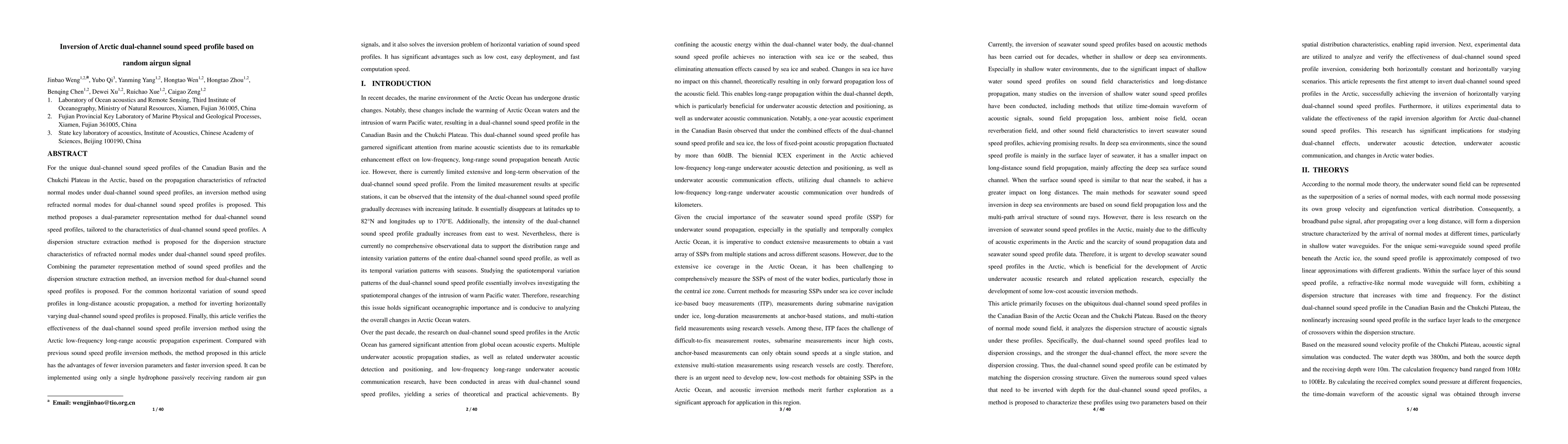 The paper proposes an inversion method for dual-channel sound speed profiles in the Arctic using random airgun signals. This method involves a dual-parameter representation for dual-channel profiles and a dispersion structure extraction method for refracted normal modes under these profiles.