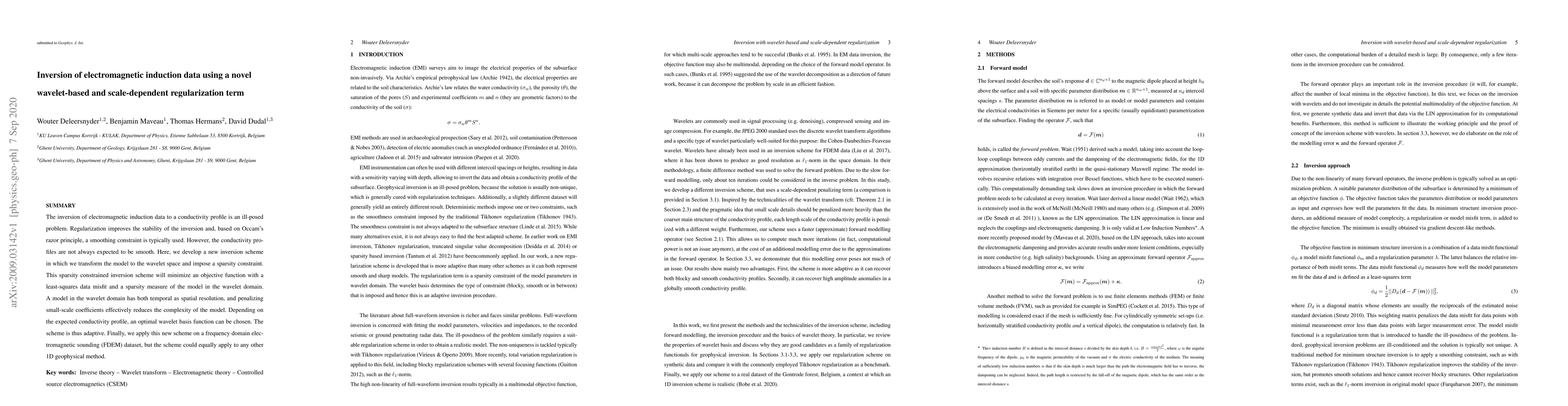This paper proposes a novel wavelet-based inversion scheme for electromagnetic induction data, incorporating a scale-dependent regularization term to enhance stability. The method transforms the model into wavelet space and employs a sparsity constraint to adaptively reduce model complexity based on expected conductivity profiles.