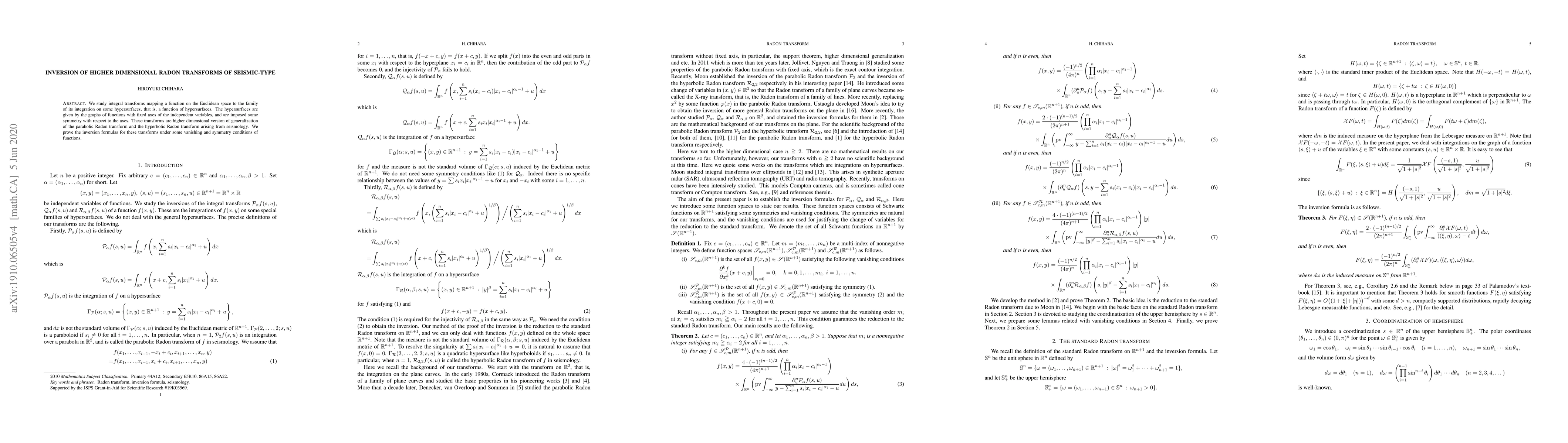 This research proves inversion formulas for higher dimensional Radon transforms, which are generalizations of seismological transforms. It establishes these under specific vanishing and symmetry conditions of functions.
