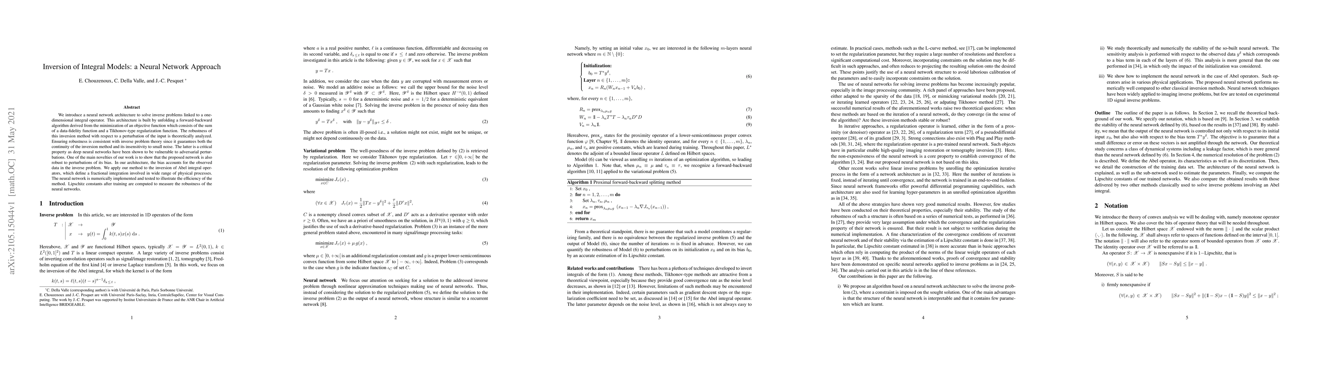 This paper presents a neural network architecture designed to solve inverse problems associated with a one-dimensional integral operator. The method, derived from a forward-backward algorithm, ensures robustness against input perturbations, including noise and bias variations. It's applied to Abel integral operators, demonstrating efficiency and computed Lipschitz constants to measure robustness.