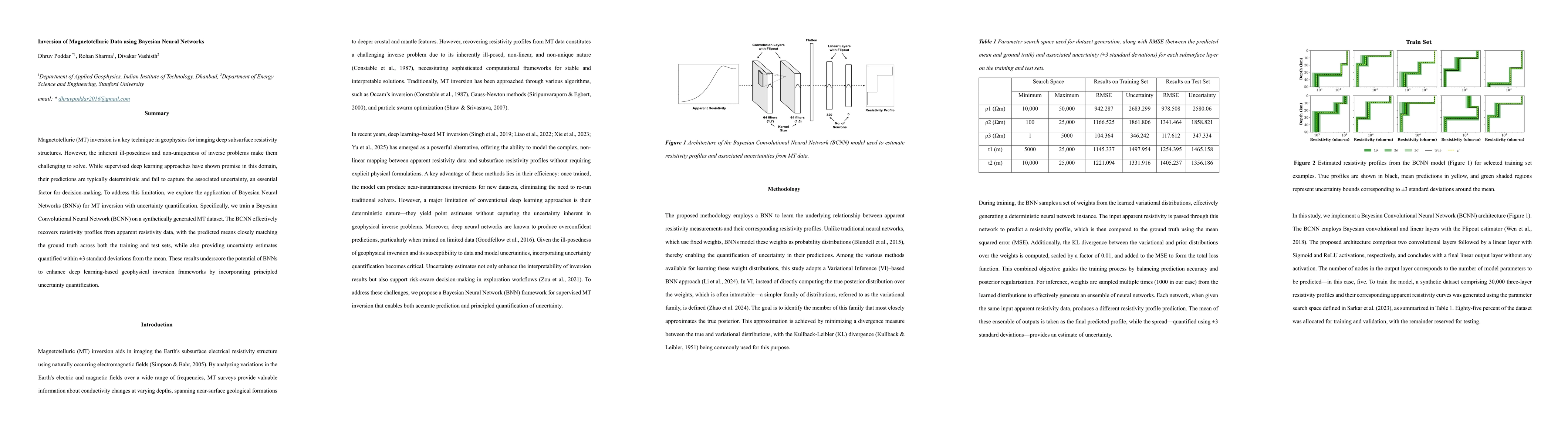 Magnetotelluric (MT) inversion is a key technique in geophysics for imaging deep subsurface resistivity structures. However, the inherent ill-posedness and non-uniqueness of inverse problems make them challenging to solve. While supervised deep learning approaches have shown promise in this domain, their predictions are typically deterministic and fail to capture the associated uncertainty, an essential factor for decision-making. To address this limitation, we explore the application of Bayesian Neural Networks (BNNs) for MT inversion with uncertainty quantification. Specifically, we train a Bayesian Convolutional Neural Network (BCNN) on a synthetically generated MT dataset. The BCNN effectively recovers resistivity profiles from apparent resistivity data, with the predicted means closely matching the ground truth across both the training and test sets, while also providing uncertainty estimates quantified within 3 standard deviations from the mean. These results underscore the potential of BNNs to enhance deep learning-based geophysical inversion frameworks by incorporating principled uncertainty quantification.