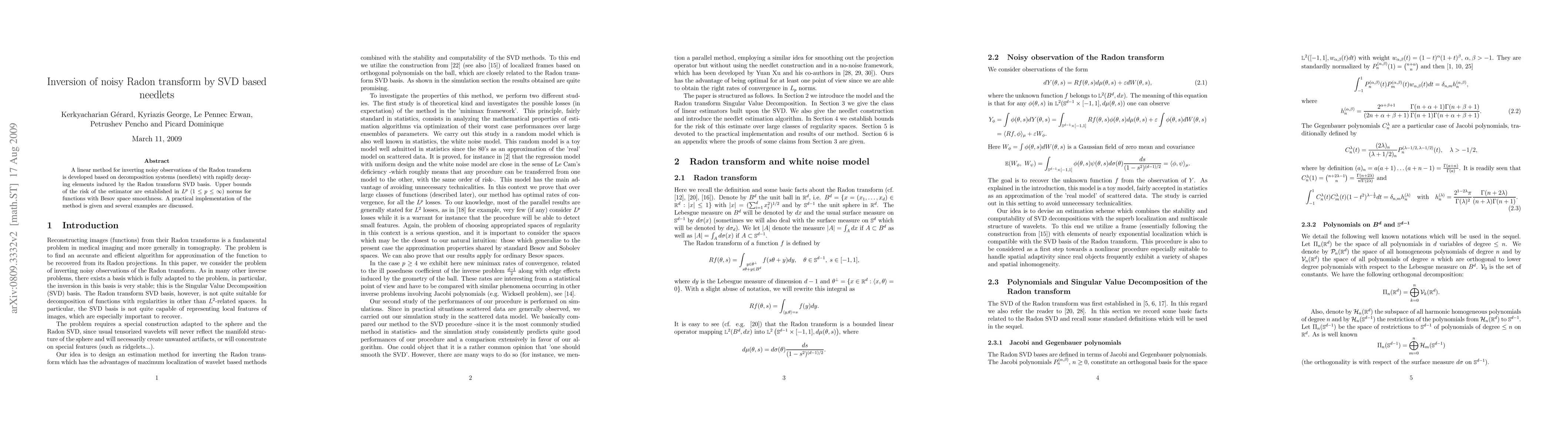 A linear method for inverting noisy observations of the Radon transform is developed based on decomposition systems (needlets) with rapidly decaying elements induced by the Radon transform SVD basis. Upper bounds of the risk of the estimator are established in $L^p$ ($1\le p\le \infty$) norms for functions with Besov space smoothness. A practical implementation of the method is given and several examples are discussed.
