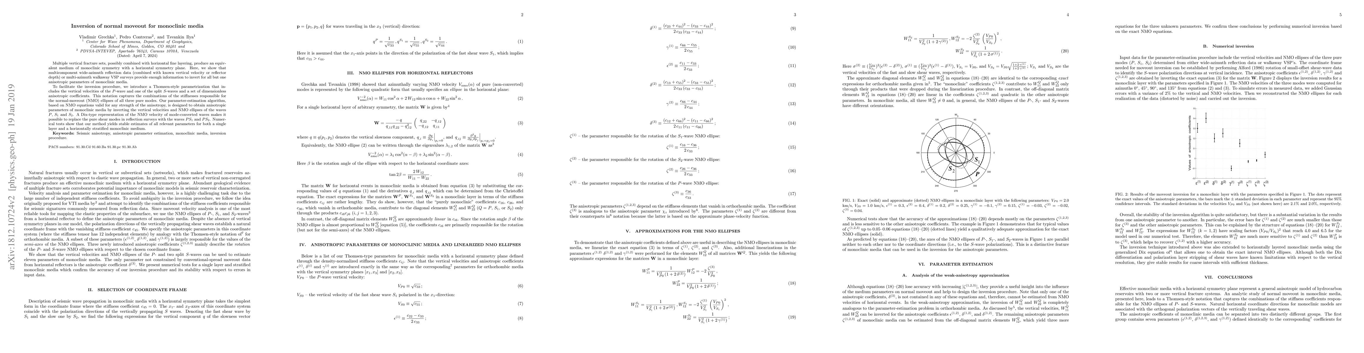 Multiple vertical fracture sets, possibly combined with horizontal fine layering, produce an equivalent medium of monoclinic symmetry with a horizontal symmetry plane. Here, we show that multi component wide azimuth reflection data (combined with known vertical velocity or reflector depth) or multi-azimuth walkaway $VSP$ surveys provide enough information to invert for all but one anisotropic parameters of monoclinic media. To facilitate the inversion procedure, we introduce a Thomsen style parametrization that includes the vertical velocities of the $P$-wave and one of the split $S$ waves and a set of dimensionless anisotropic coefficients. This notation captures the combinations of the stiffnesses responsible for the normal moveout $(NMO)$ ellipses of all three pure modes. Our parameter-estimation algorithm, based on NMO equations valid for any strength of the anisotropy, is designed to obtain anisotropic parameters of monoclinic media by inverting the vertical velocities and NMO ellipses of the waves $P$, S$_1$ and S$_2$. A Dix type representation of the NMO velocity of mode-converted waves makes it possible to replace the pure shear modes in reflection surveys with the waves PS$_1$ and PS$_2$. Numerical tests show that our method yields stable estimates of all relevant parameters for both a single layer and a horizontally stratified monoclinic medium.