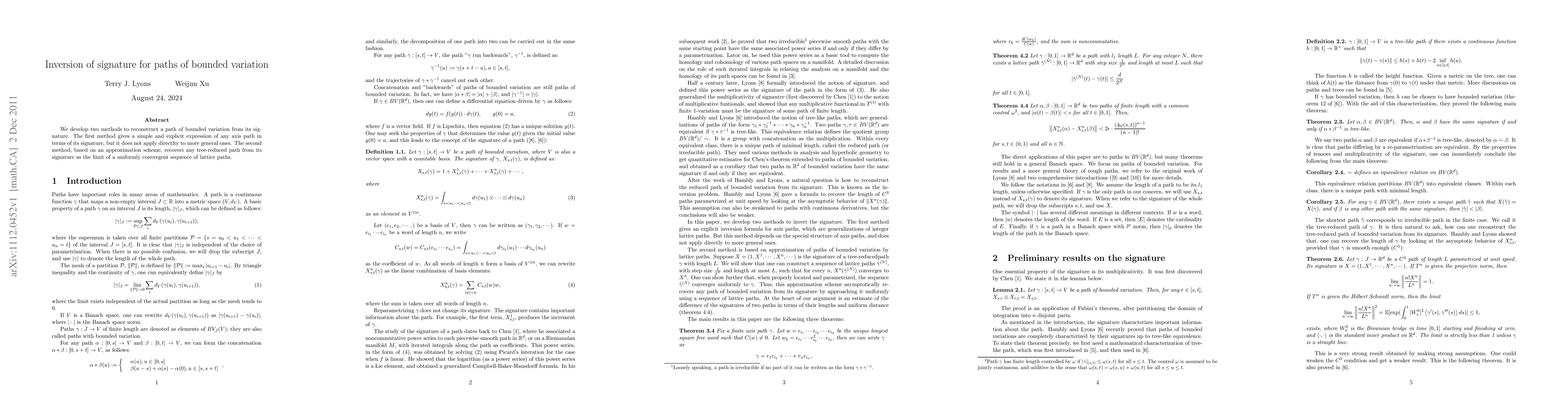 We develop two methods to reconstruct a path of bounded variation from its signature. The first method gives a simple and explicit expression of any axis path in terms of its signature, but it does not apply directlty to more general ones. The second method, based on an approximation scheme, recovers any tree-reduced path from its signature as the limit of a uniformly convergent sequence of lattice paths.