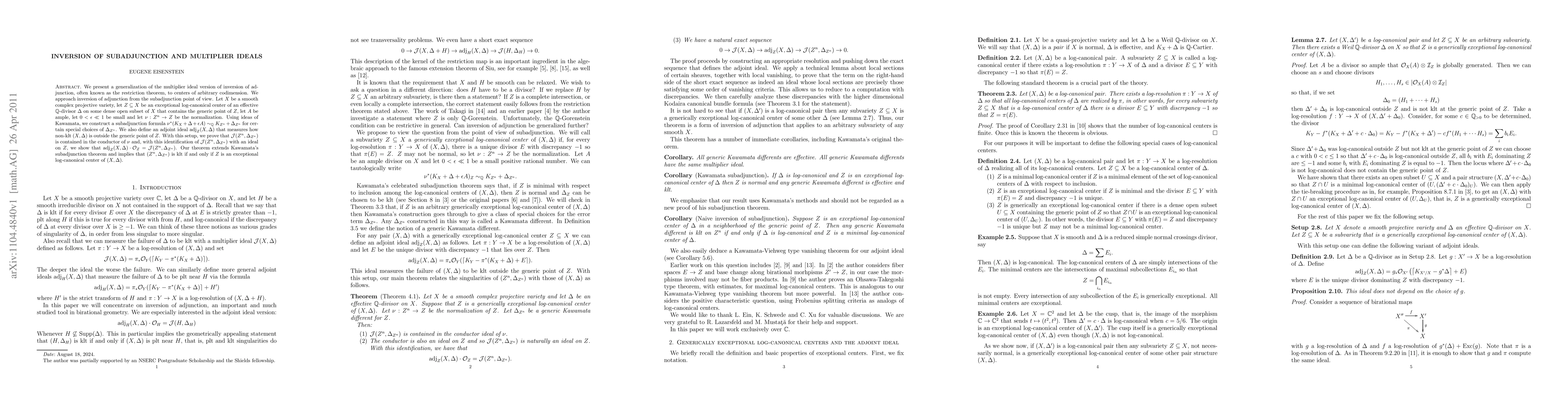 This paper generalizes the inversion of adjunction to centers of arbitrary codimension, defining an adjoint ideal that measures non-klt behavior. The main theorem shows that this adjoint ideal restricts on exceptional log-canonical centers to the multiplier ideal of an appropriate boundary, extending Kawamata's subadjunction theorem.
