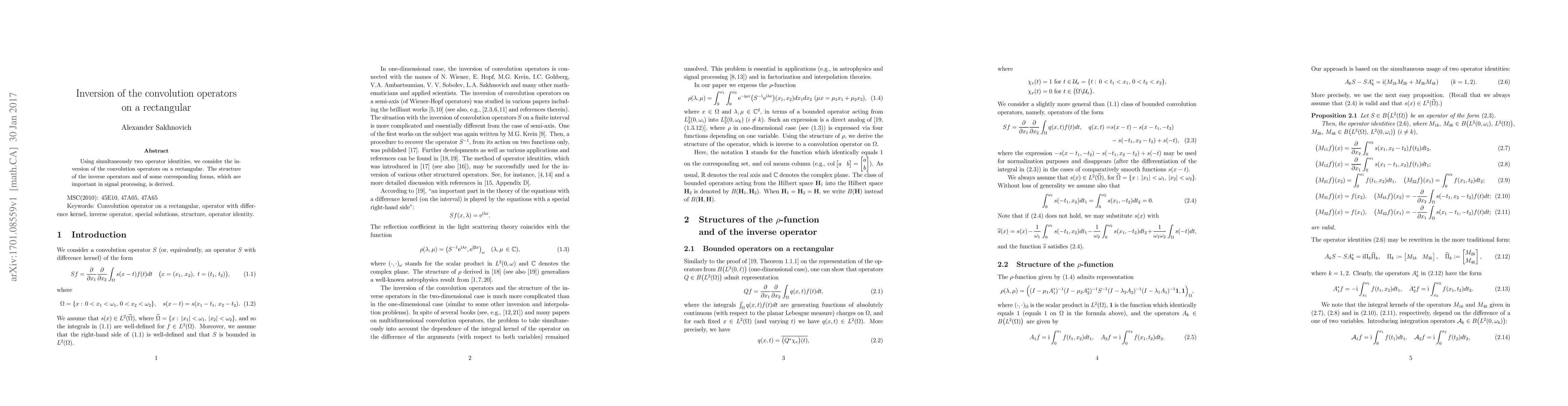 This paper explores the inversion of convolution operators on a rectangular domain by leveraging two operator identities. It derives the structure of the inverse operators and related forms significant for signal processing applications.