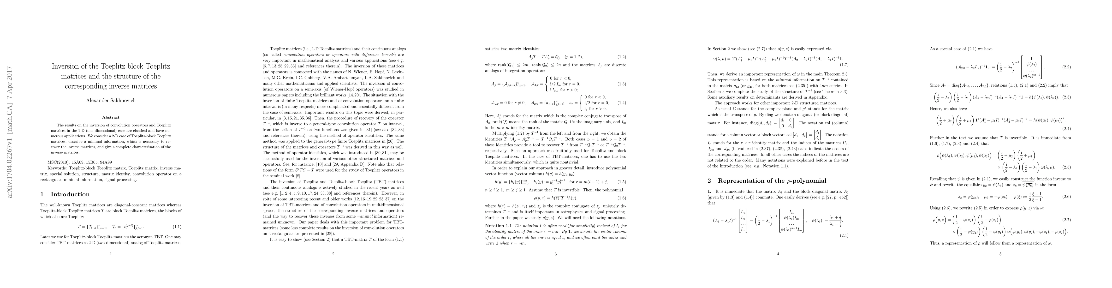 The results on the inversion of convolution operators and Toeplitz matrices in the 1-D (one dimensional) case are classical and have numerous applications. We consider a 2-D case of Toeplitz-block Toeplitz matrices, describe a minimal information, which is necessary to recover the inverse matrices, and give a complete characterisation of the inverse matrices.