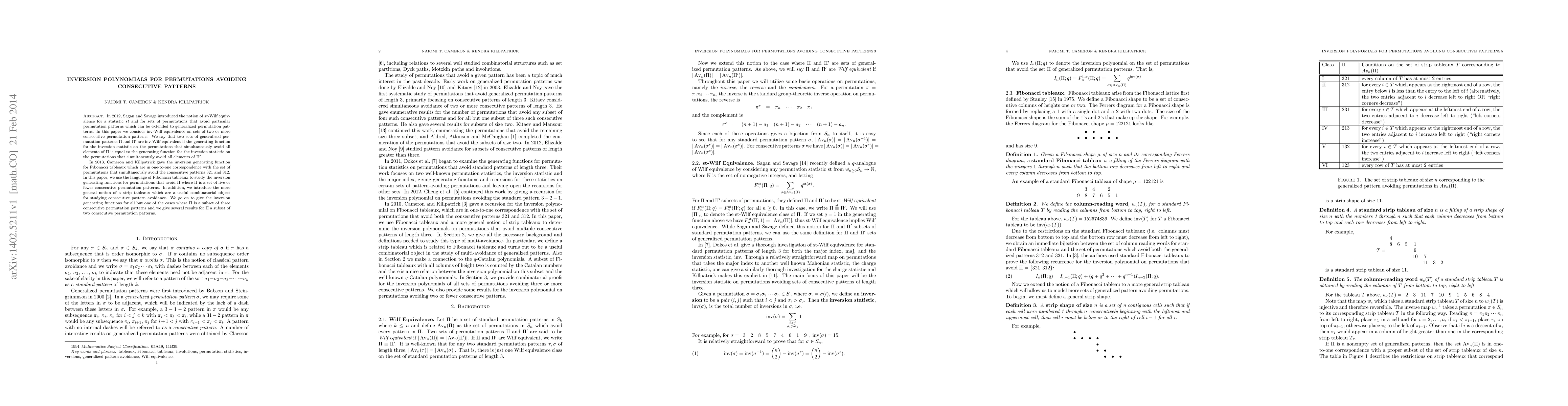 In 2012, Sagan and Savage introduced the notion of $st$-Wilf equivalence for a statistic $st$ and for sets of permutations that avoid particular permutation patterns which can be extended to generalized permutation patterns. In this paper we consider $inv$-Wilf equivalence on sets of two or more consecutive permutation patterns. We say that two sets of generalized permutation patterns $\Pi$ and $\Pi'$ are $inv$-Wilf equivalent if the generating function for the inversion statistic on the permutations that simultaneously avoid all elements of $\Pi$ is equal to the generating function for the inversion statistic on the permutations that simultaneously avoid all elements of $\Pi'$. In 2013, Cameron and Killpatrick gave the inversion generating function for Fibonacci tableaux which are in one-to-one correspondence with the set of permutations that simultaneously avoid the consecutive patterns $321$ and $312.$ In this paper, we use the language of Fibonacci tableaux to study the inversion generating functions for permutations that avoid $\Pi$ where $\Pi$ is a set of five or fewer consecutive permutation patterns. In addition, we introduce the more general notion of a strip tableaux which are a useful combinatorial object for studying consecutive pattern avoidance. We go on to give the inversion generating functions for all but one of the cases where $\Pi$ is a subset of three consecutive permutation patterns and we give several results for $\Pi$ a subset of two consecutive permutation patterns.