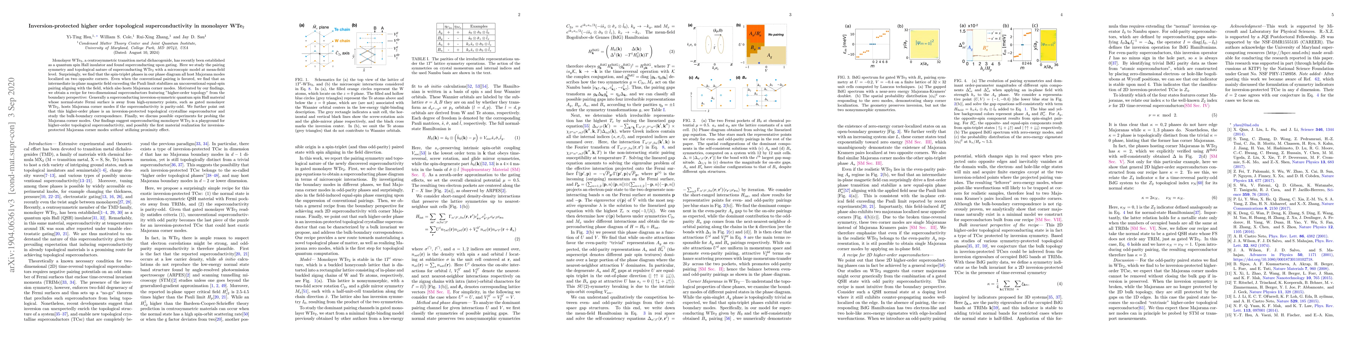This study reveals that superconducting monolayer WTe$_2$ exhibits higher-order topological superconductivity, hosting Majorana modes at opposite corners even when conventional pairing is favored, due to an unconventional equal-spin pairing under specific magnetic field conditions. The research proposes a method for identifying such topological superconductors in inversion-symmetric quantum spin Hall materials.