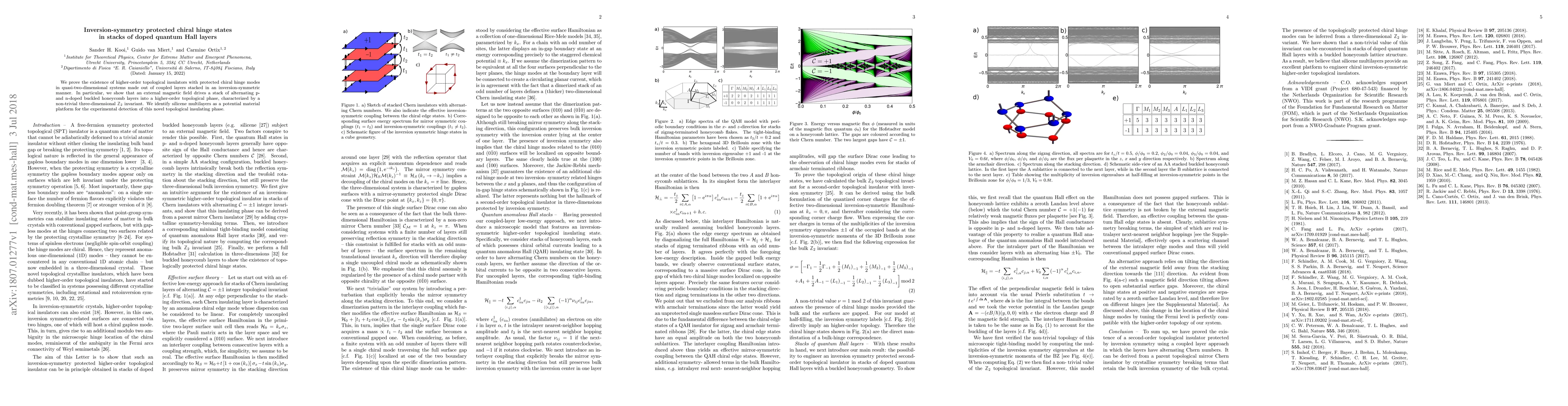 We prove the existence of higher-order topological insulators with protected chiral hinge modes in quasi-two-dimensional systems made out of coupled layers stacked in an inversion-symmetric manner. In particular, we show that an external magnetic field drives a stack of alternating p- and n-doped buckled honeycomb layers into a higher-order topological phase, characterized by a non-trivial three-dimensional ${\mathbb Z}_2$ invariant. We identify silicene multilayers as a potential material platform for the experimental detection of this novel topological insulating phase.