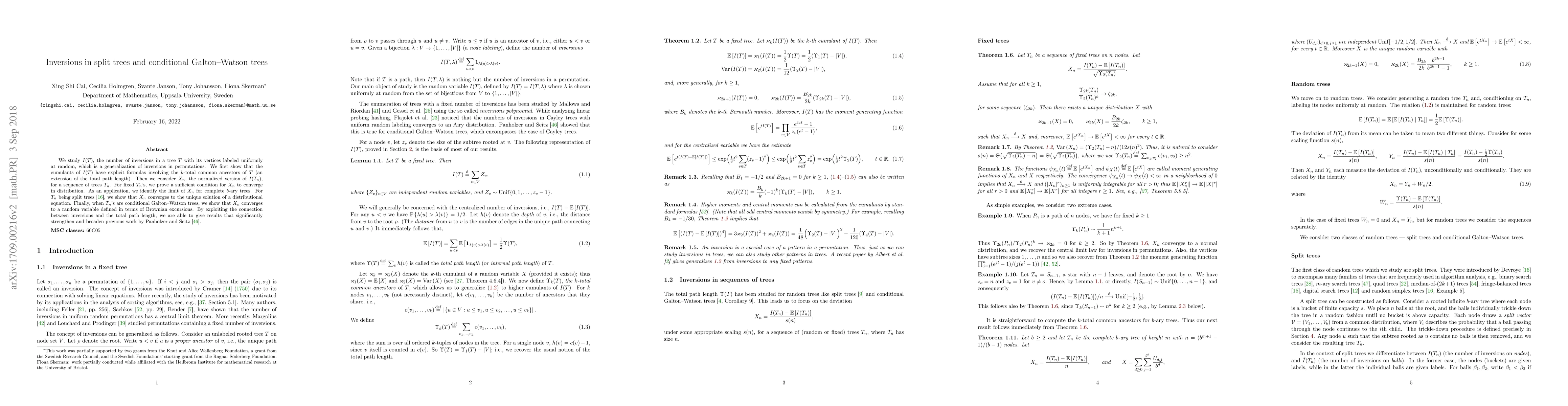 This paper investigates the number of inversions in split trees and conditional Galton-Watson trees, deriving explicit formulas for their cumulants. It proves convergence in distribution for normalized inversions in various tree sequences, identifying limits for complete $b$-ary trees, split trees, and conditional Galton-Watson trees.
