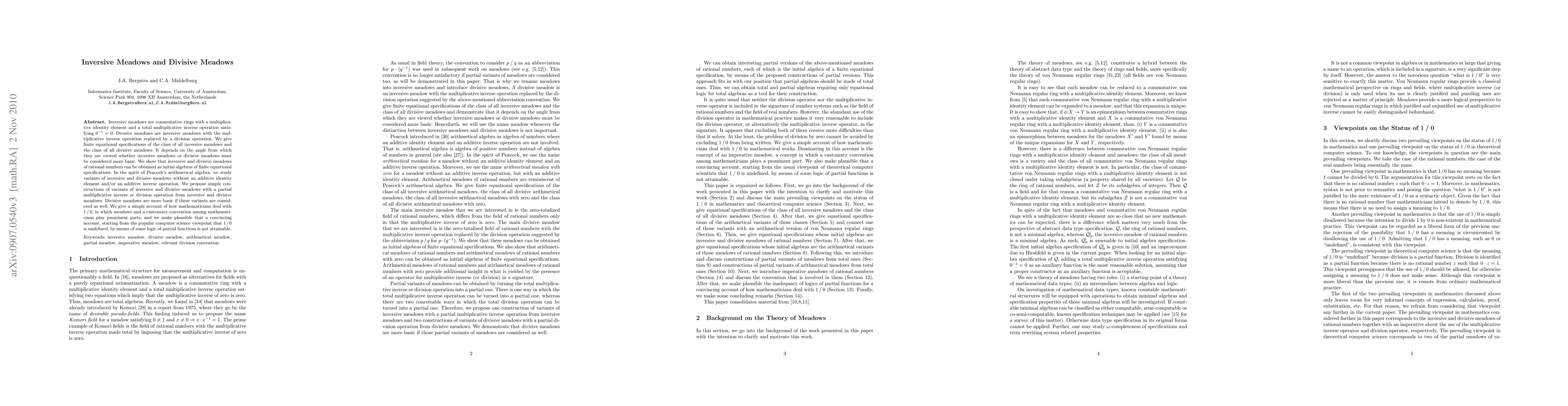 This paper explores the algebraic structures of inversive and divisive meadows, providing finite equational specifications for both. It argues that divisive meadows are more fundamental when considering variants with partial operations, and discusses the treatment of division by zero in mathematical practice.