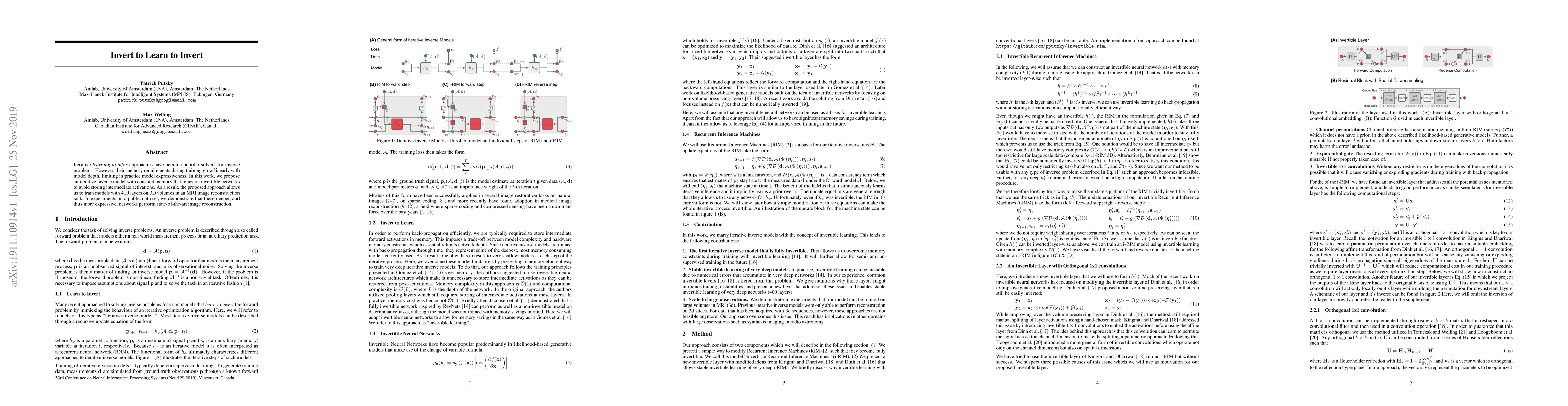 Iterative learning to infer approaches have become popular solvers for inverse problems. However, their memory requirements during training grow linearly with model depth, limiting in practice model expressiveness. In this work, we propose an iterative inverse model with constant memory that relies on invertible networks to avoid storing intermediate activations. As a result, the proposed approach allows us to train models with 400 layers on 3D volumes in an MRI image reconstruction task. In experiments on a public data set, we demonstrate that these deeper, and thus more expressive, networks perform state-of-the-art image reconstruction.