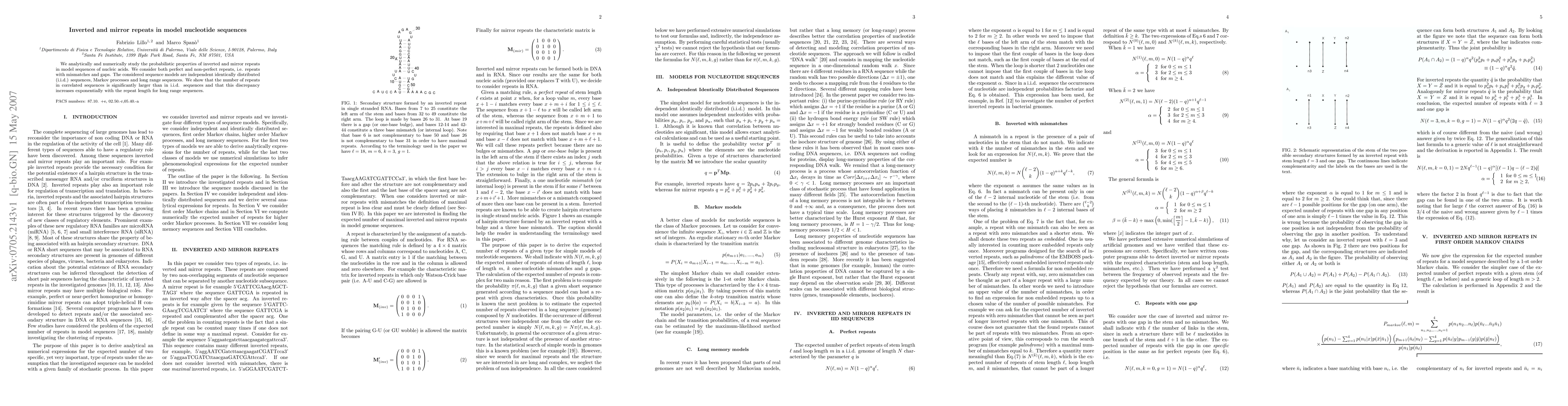 This paper investigates the probabilistic properties of inverted and mirror repeats in various model sequences of nucleic acids, including perfect and non-perfect repeats. It finds that correlated sequences, such as those from Markov processes and long range sequences, contain significantly more repeats than independent identically distributed sequences, with the difference growing exponentially with repeat length.