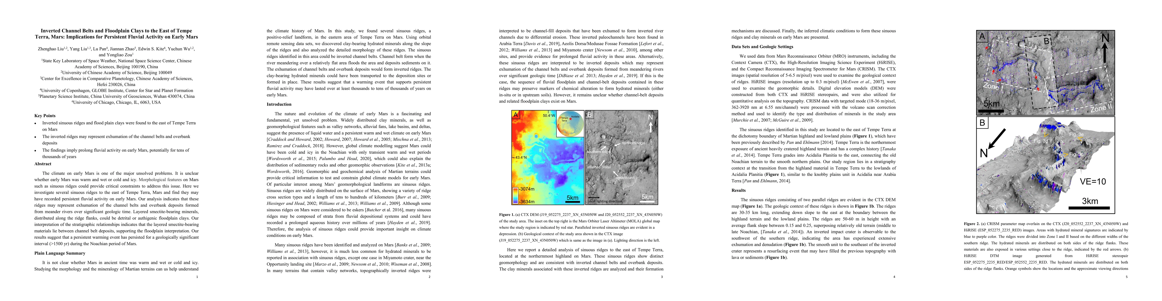 This research investigates sinuous ridges east of Tempe Terra on Mars, suggesting they record persistent fluvial activity indicating a warm and wet early Martian climate. The presence of smectite-bearing minerals supports the interpretation of these ridges as floodplain clays formed by meandering rivers, implying a prolonged warming event during the Noachian period.