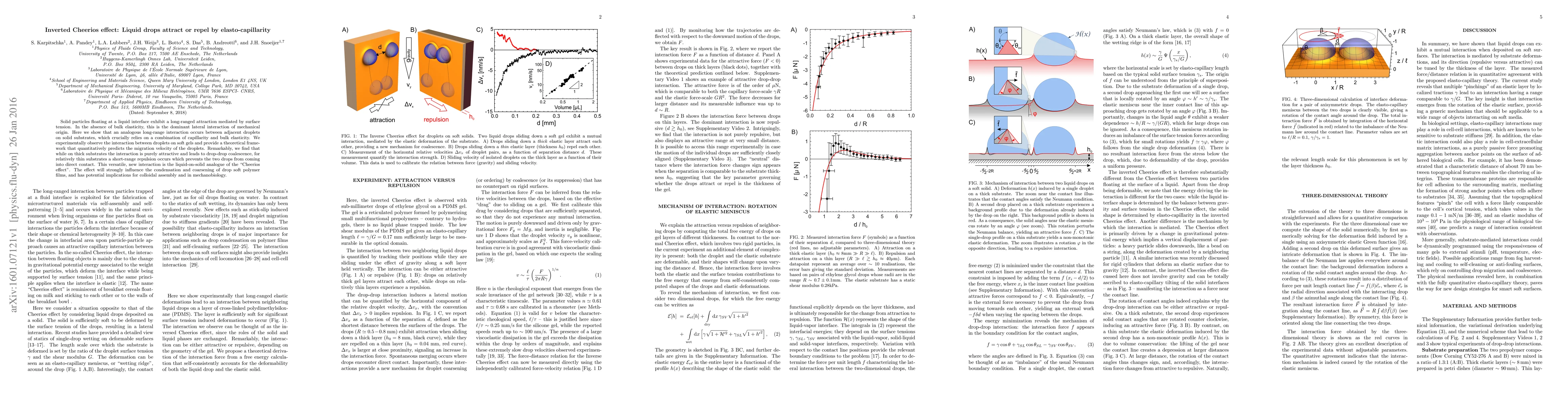 This paper investigates the "inverted Cheerios effect," where liquid droplets on elastic substrates can either attract and coalesce or repel each other, depending on substrate thickness. The study combines experimental observations and theoretical modeling to explain these interactions, revealing significant implications for droplet behavior in soft polymer films and colloidal assembly.