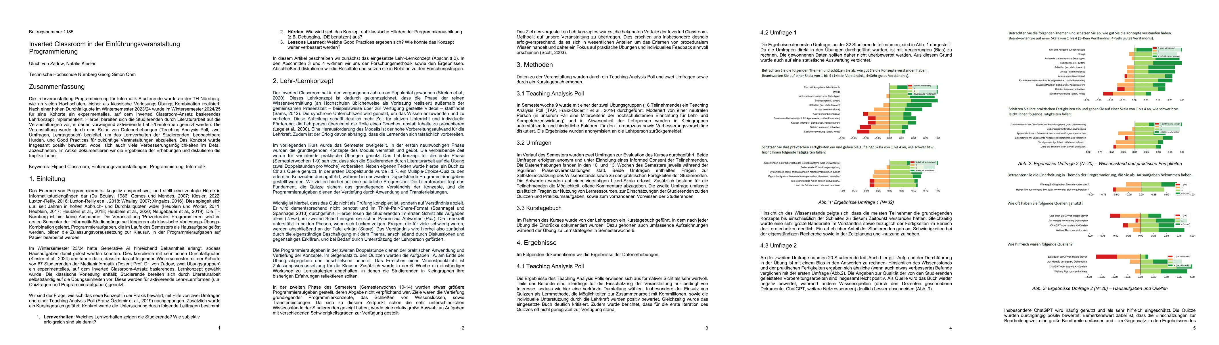 Traditionally, the introductory programming course for computer science students at Nuremberg Tech had been implemented as a combination of lectures and exercise sessions. Due to high failure rates in the winter semester 2023/24, an experimental teaching concept based on the inverted classroom was implemented for one cohort in the winter semester 2024/25. Students had to prepare themselves through literature work and activating teaching and learning methods. The course was accompanied by a series of data collections (i.e., a Teaching Analysis Poll, two surveys, and a teaching diary) to gain insights into students' learning methods and behaviors. The concept was evaluated positively overall, although many detailed opportunities for improvement were identified. In this article, we document the results of the surveys and discuss the implications