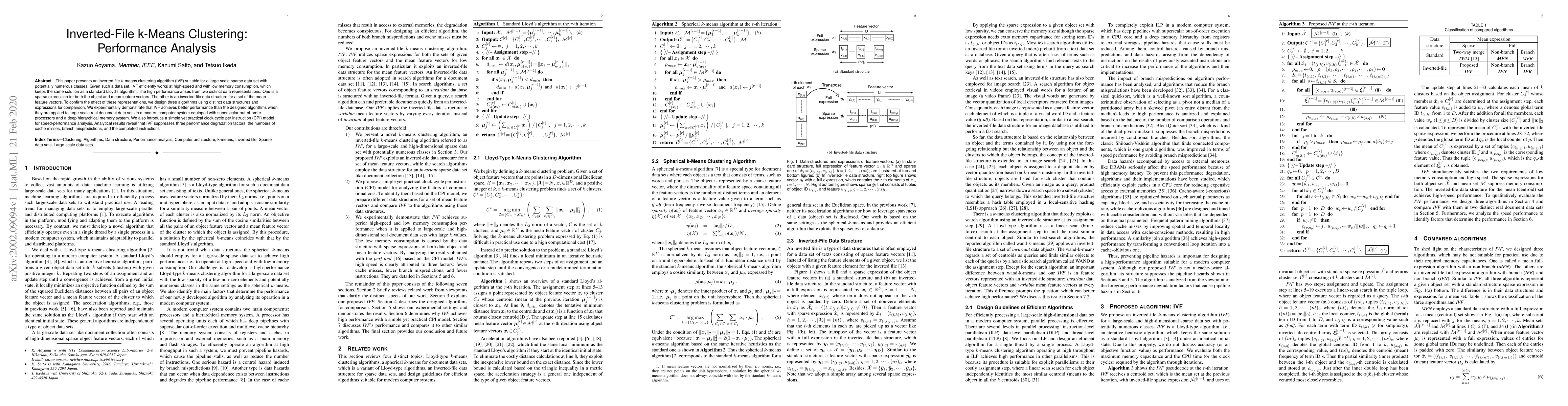 This paper introduces an inverted-file k-means clustering algorithm (IVF) for large-scale sparse datasets, demonstrating superior performance and low memory usage compared to standard methods. Experimental results show IVF's effectiveness in modern computer systems, attributing its efficiency to sparse data representations and an inverted-file structure.