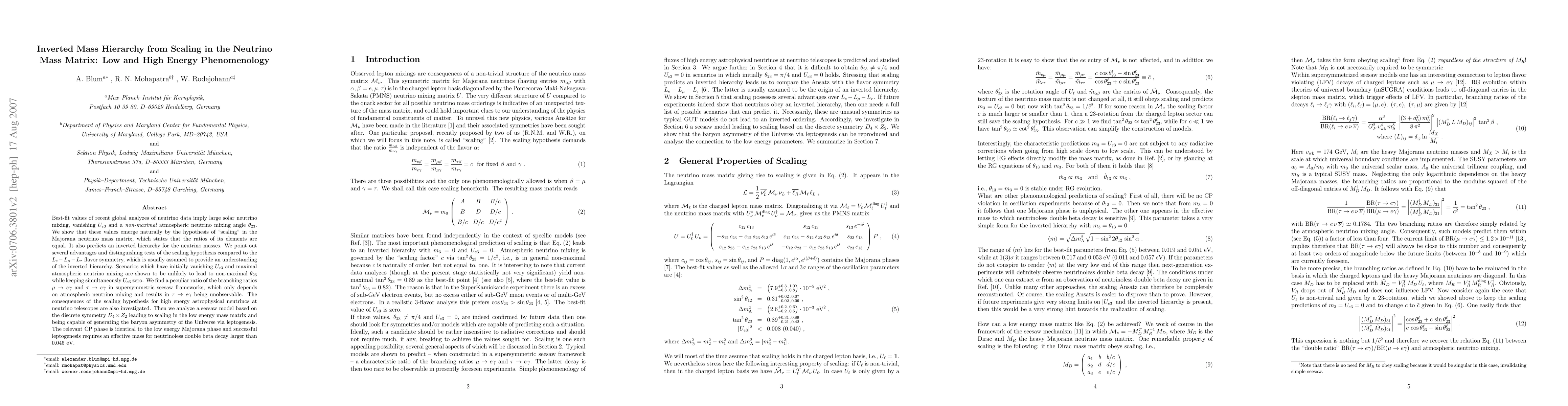 Best-fit values of recent global analyzes of neutrino data imply large solar neutrino mixing, vanishing U_{e3} and a non-maximal atmospheric neutrino mixing angle theta_{23}. We show that these values emerge naturally by the hypothesis of "scaling" in the Majorana neutrino mass matrix, which states that the ratios of its elements are equal. It also predicts an inverted hierarchy for the neutrino masses. We point out several advantages and distinguishing tests of the scaling hypothesis compared to the L_e - L_mu - L_tau flavor symmetry, which is usually assumed to provide an understanding of the inverted hierarchy. Scenarios which have initially vanishing U_{e3} and maximal atmospheric neutrino mixing are shown to be unlikely to lead to non-maximal theta_{23} while keeping simultaneously U_{e3} zero. We find a peculiar ratio of the branching ratios mu -> e gamma and tau -> e gamma in supersymmetric seesaw frameworks, which only depends on atmospheric neutrino mixing and results in tau -> e gamma being unobservable. The consequences of the scaling hypothesis for high energy astrophysical neutrinos at neutrino telescopes are also investigated. Then we analyze a seesaw model based on the discrete symmetry D_4 times Z_2 leading to scaling in the low energy mass matrix and being capable of generating the baryon asymmetry of the Universe via leptogenesis. The relevant CP phase is identical to the low energy Majorana phase and successful leptogenesis requires an effective mass for neutrinoless double beta decay larger than 0.045 eV.