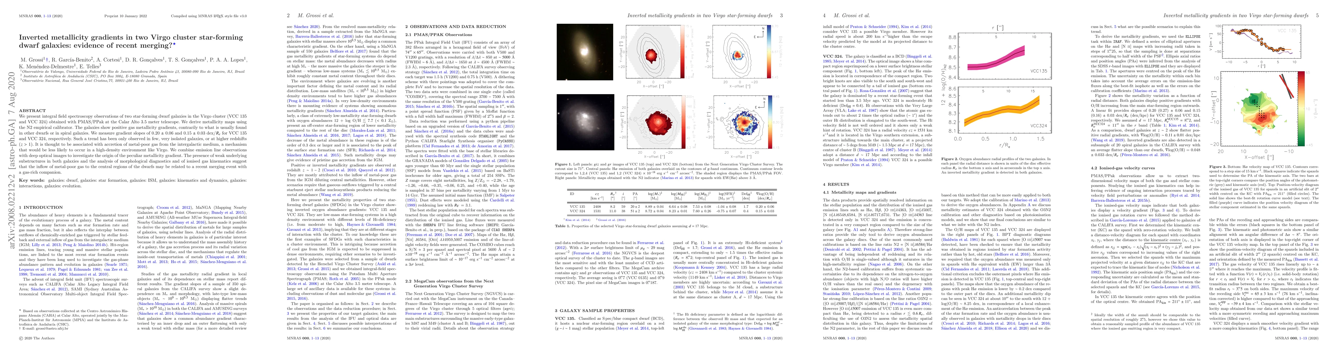 We present integral field spectroscopy observations of two star-forming dwarf galaxies in the Virgo cluster (VCC135 and VCC324) obtained with PMAS/PPak at the Calar Alto 3.5 meter telescope. We derive metallicity maps using the N2 empirical calibrator. The galaxies show positive gas metallicity gradients, contrarily to what is usually found in other dwarfs or in spiral galaxies. We measure gradient slopes of 0.20 $\pm$ 0.06 and 0.15 $\pm$ 0.03 dex/$R_e$ for VCC135 and VCC324, respectively. Such a trend has been only observed in few, very isolated galaxies, or at higher redshifts ($z >$ 1). It is thought to be associated with accretion of metal-poor gas from the intergalactic medium, a mechanism that would be less likely to occur in a high-density environment like Virgo. We combine emission line observations with deep optical images to investigate the origin of the peculiar metallicity gradient. The presence of weak underlying substructures in both galaxies and the analysis of morphological diagnostics and of ionised gas kinematics suggest that the inflow of metal-poor gas to the central regions of the dwarfs may be related to a recent merging event with a gas-rich companion.