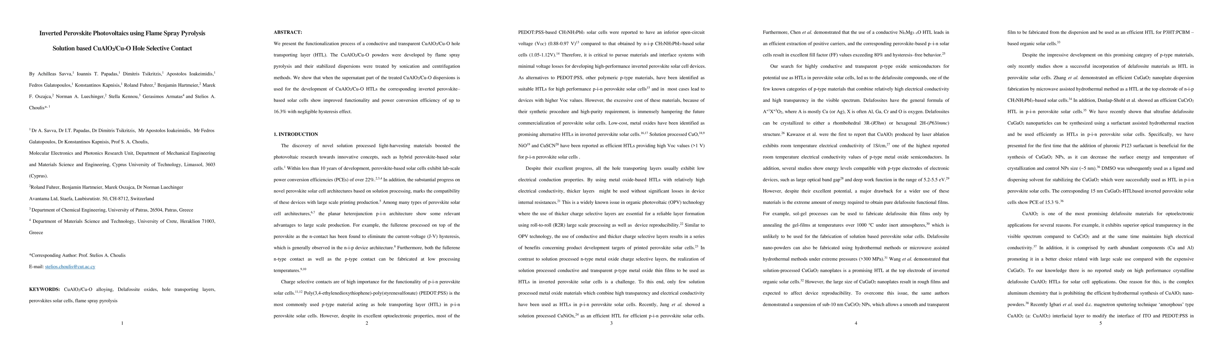 We present the functionalization process of a conductive and transparent copper aluminum oxide, copper oxide alloy. The copper aluminum oxide, copper oxide powders were developed by flame spray pyrolysis and their stabilized dispersions were treated by sonication and centrifugation methods. We show that when the supernatant part of the treated copper aluminum oxide, copper oxide dispersions is used for the development of hole transporting layers the corresponding inverted perovskite solar cells show improved functionality and power conversion efficiency with negligible hysteresis effect.