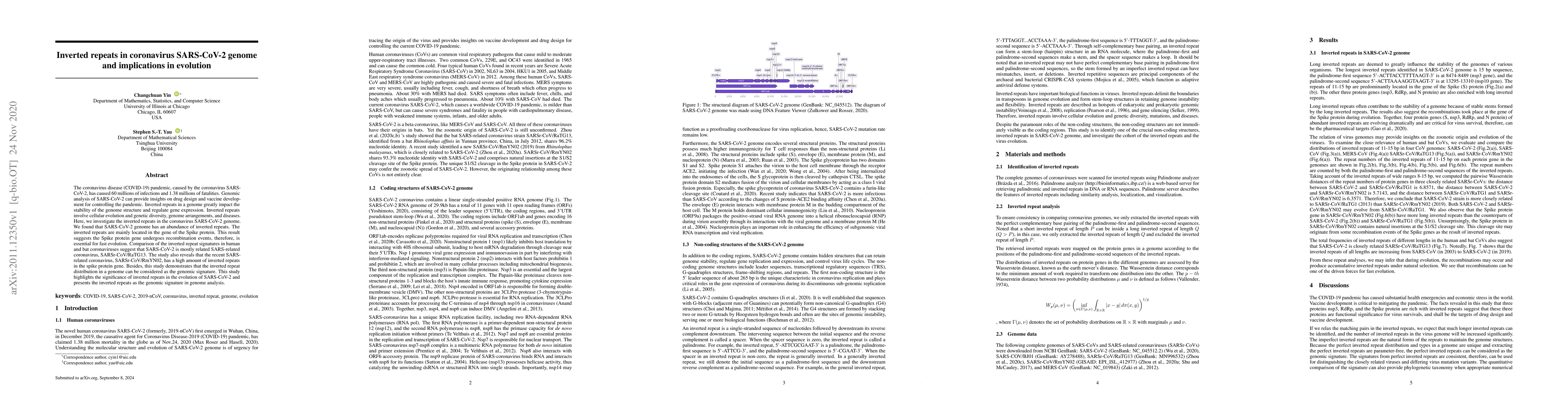 This study investigates the abundance of inverted repeats in the SARS-CoV-2 genome, finding they are mainly located in the Spike protein gene, suggesting rapid evolution through recombination events. Comparative analysis with human and bat coronaviruses indicates a close relation to SARSr-CoV/RaTG13, highlighting the significance of inverted repeats as genomic signatures in evolutionary studies.
