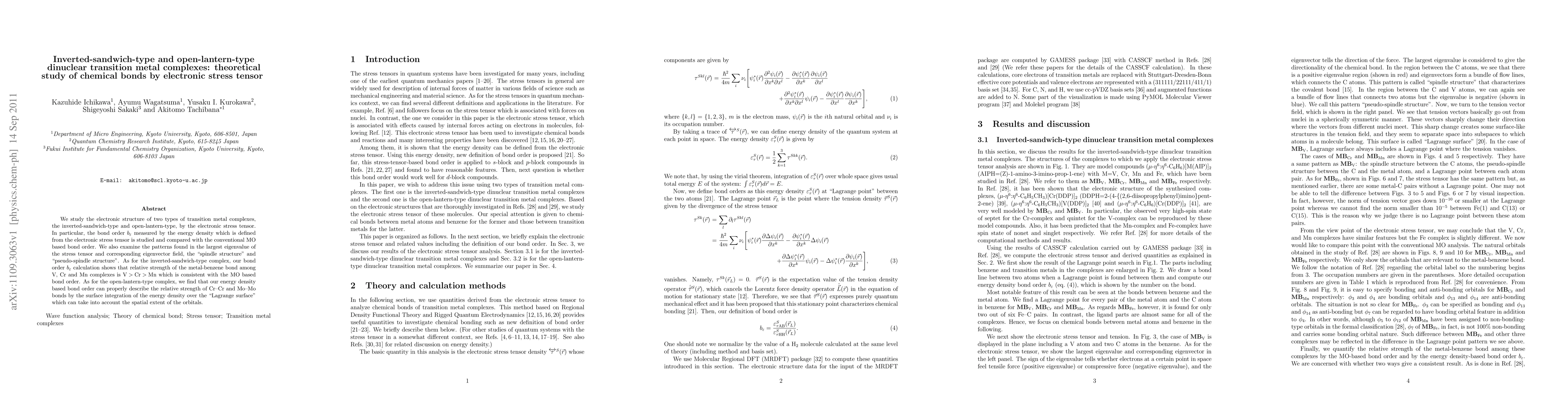 Researchers studied electronic structure of dinuclear transition metal complexes using the electronic stress tensor, finding consistent bond orders with conventional MO-based methods for certain metals.