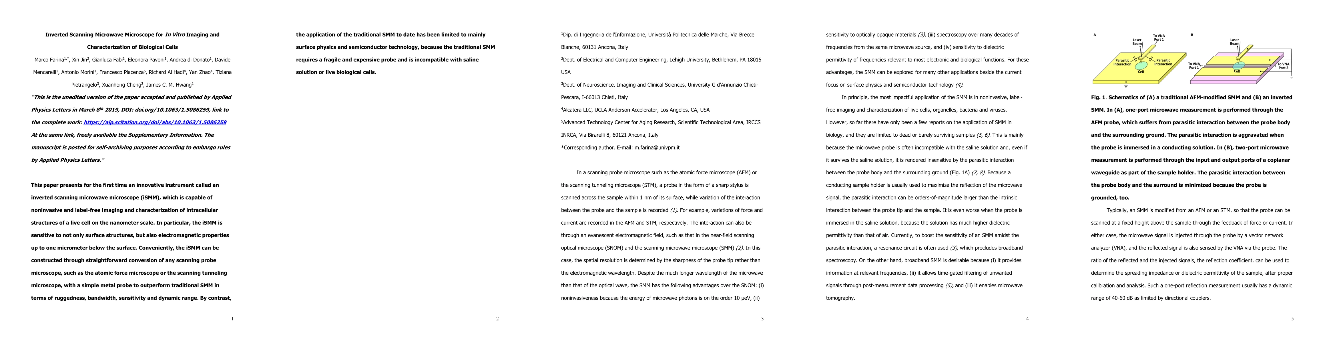 This paper presents for the first time an innovative instrument called an inverted scanning microwave microscope (iSMM), which is capable of noninvasive and label-free imaging and characterization of intracellular structures of a live cell on the nanometer scale. In particular, the iSMM is sensitive to not only surface structures, but also ectromagnetic properties up to one micrometer below the surface. Conveniently, the iSMM can be constructed through straightforward conversion of any scanning probe microscope, such as the atomic force microscope or the scanning tunneling microscope, with a simple metal probe to outperform traditional SMM in terms of ruggedness, and width, sensitivity and dynamic range. By contrast, the application of the traditional SMM to date has been limited to mainly surface physics and semiconductor technology, because the traditional SMM requires a fragile and expensive probe and is incompatible with saline solution or live biological cells.