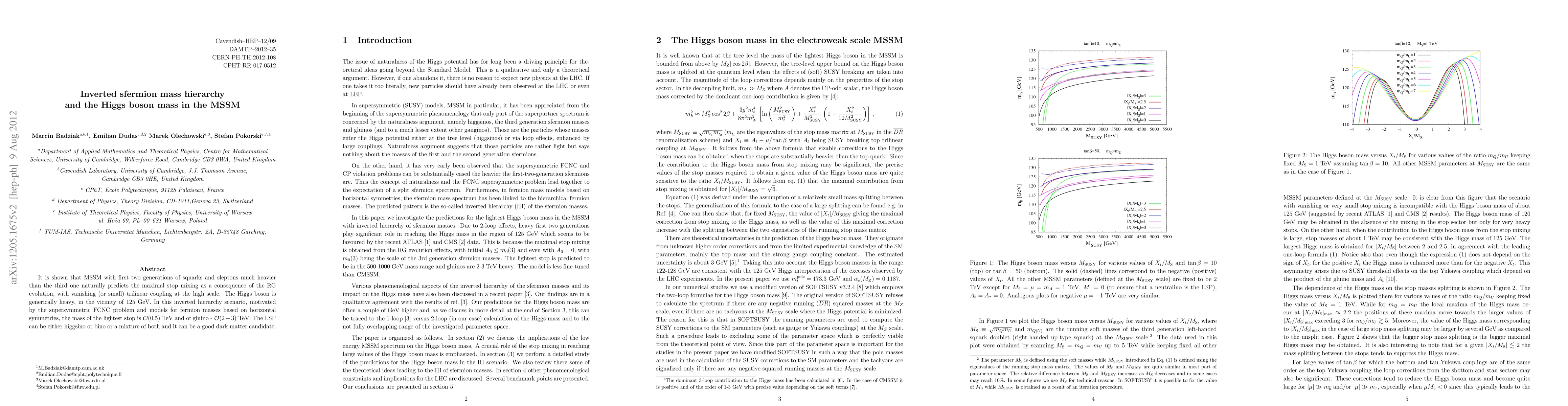 The Minimal Supersymmetric Standard Model (MSSM) with heavier first two generations of squarks and sleptons naturally predicts maximal stop mixing and a heavy Higgs boson near 125 GeV due to RG evolution. This inverted mass hierarchy scenario, driven by supersymmetric FCNC concerns and horizontal symmetries, suggests a lightest stop mass of ~0.5 TeV, a gluino mass of 2-3 TeV, and a viable dark matter candidate from the Lightest Supersymmetric Particle (LSP), which can be higgsino, bino, or a mixture of both.