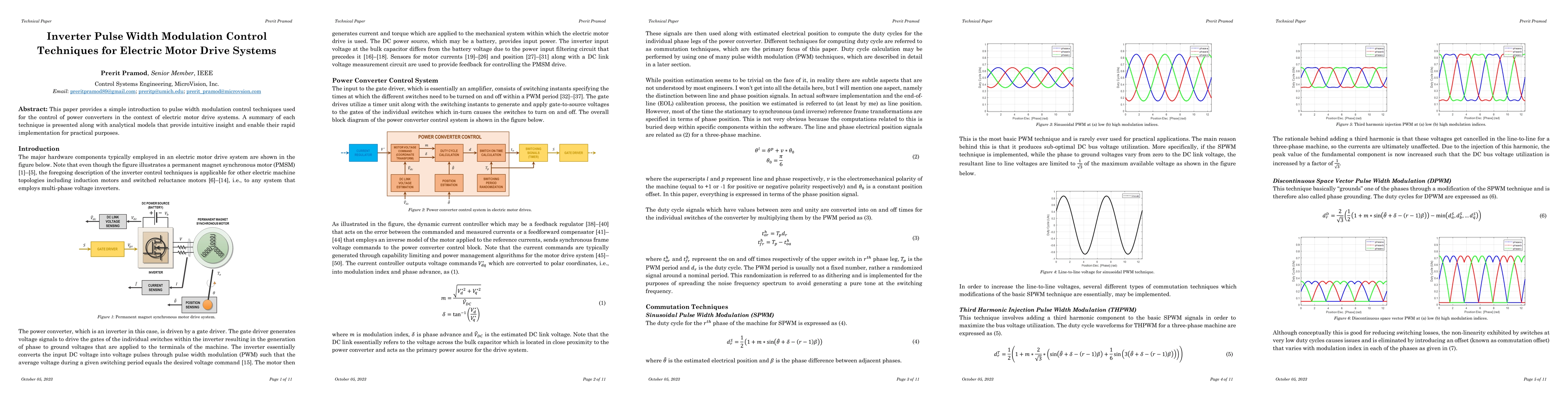 This paper introduces various pulse width modulation control techniques for electric motor drive systems, offering analytical models to facilitate understanding and quick implementation. Each technique is summarized to provide practical insights for power converter control.