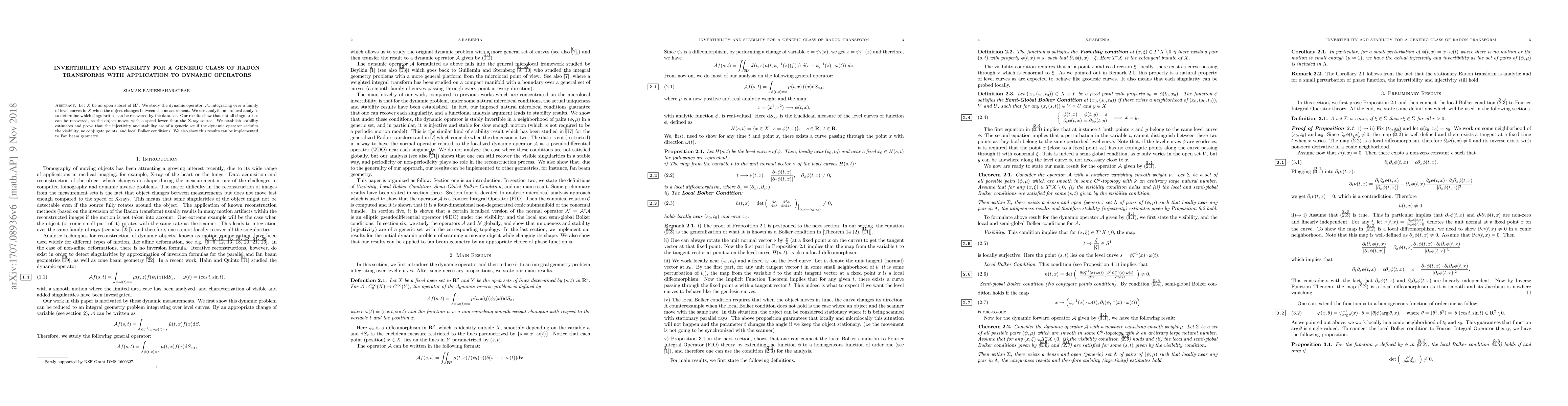 This paper investigates the invertibility and stability of a dynamic operator integrating over level curves in an open subset of R^2, using analytic microlocal analysis. It establishes that not all singularities can be recovered when the object moves slower than the X-ray source, and proves that injectivity and stability hold generically under certain conditions, with applications to Fan beam geometry.