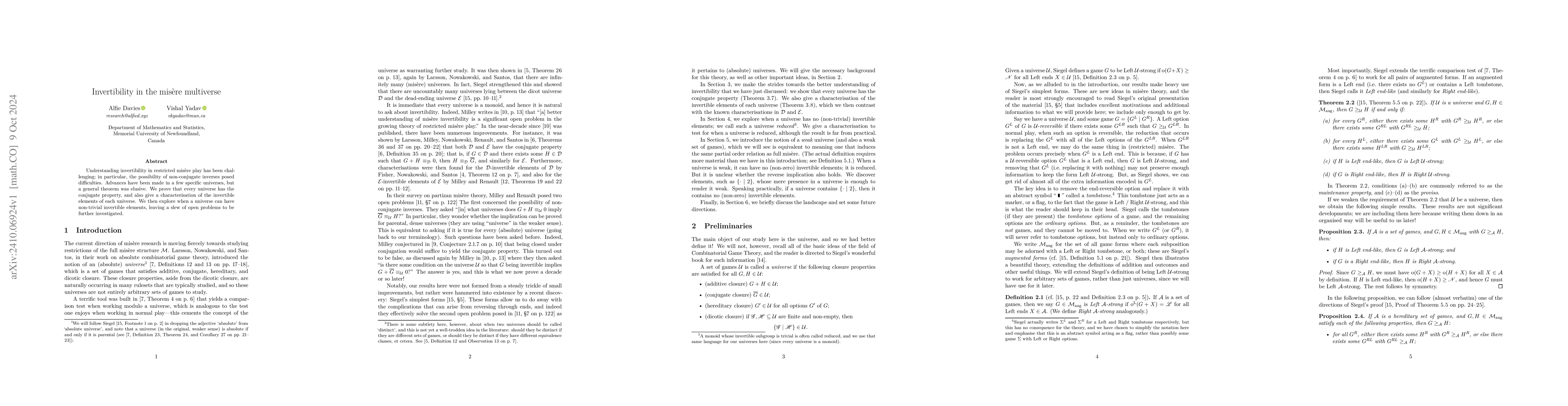 Understanding invertibility in restricted mis\`ere play has been challenging; in particular, the possibility of non-conjugate inverses posed difficulties. Advances have been made in a few specific universes, but a general theorem was elusive. We prove that every universe has the conjugate property, and also give a characterisation of the invertible elements of each universe. We then explore when a universe can have non-trivial invertible elements, leaving a slew of open problems to be further investigated.