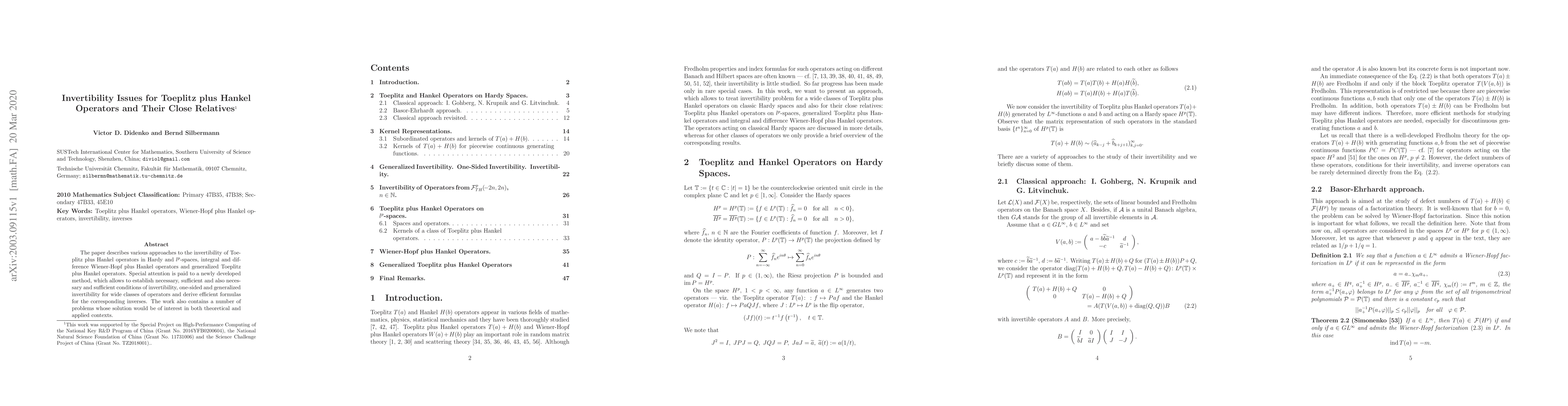This paper investigates the invertibility of Toeplitz plus Hankel operators in various function spaces, introducing a novel method to establish necessary and sufficient conditions for invertibility and derive efficient inverse formulas. It also poses several open problems of theoretical and applied significance.
