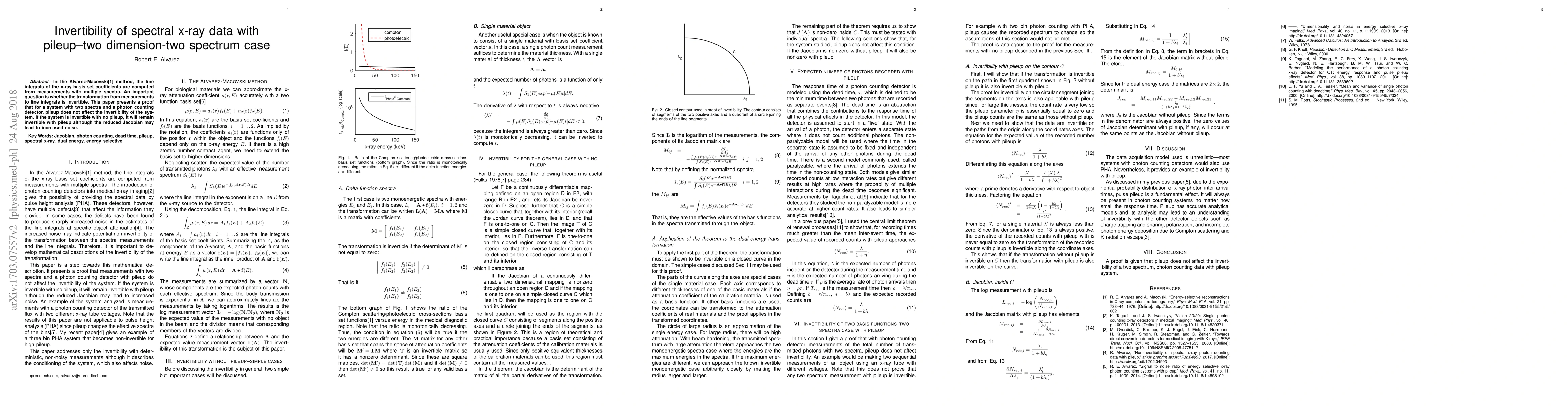 Researchers found that pileup in x-ray data does not affect the invertibility of a two-spectrum system with a photon counting detector. Invertibility remains possible even with reduced Jacobian.